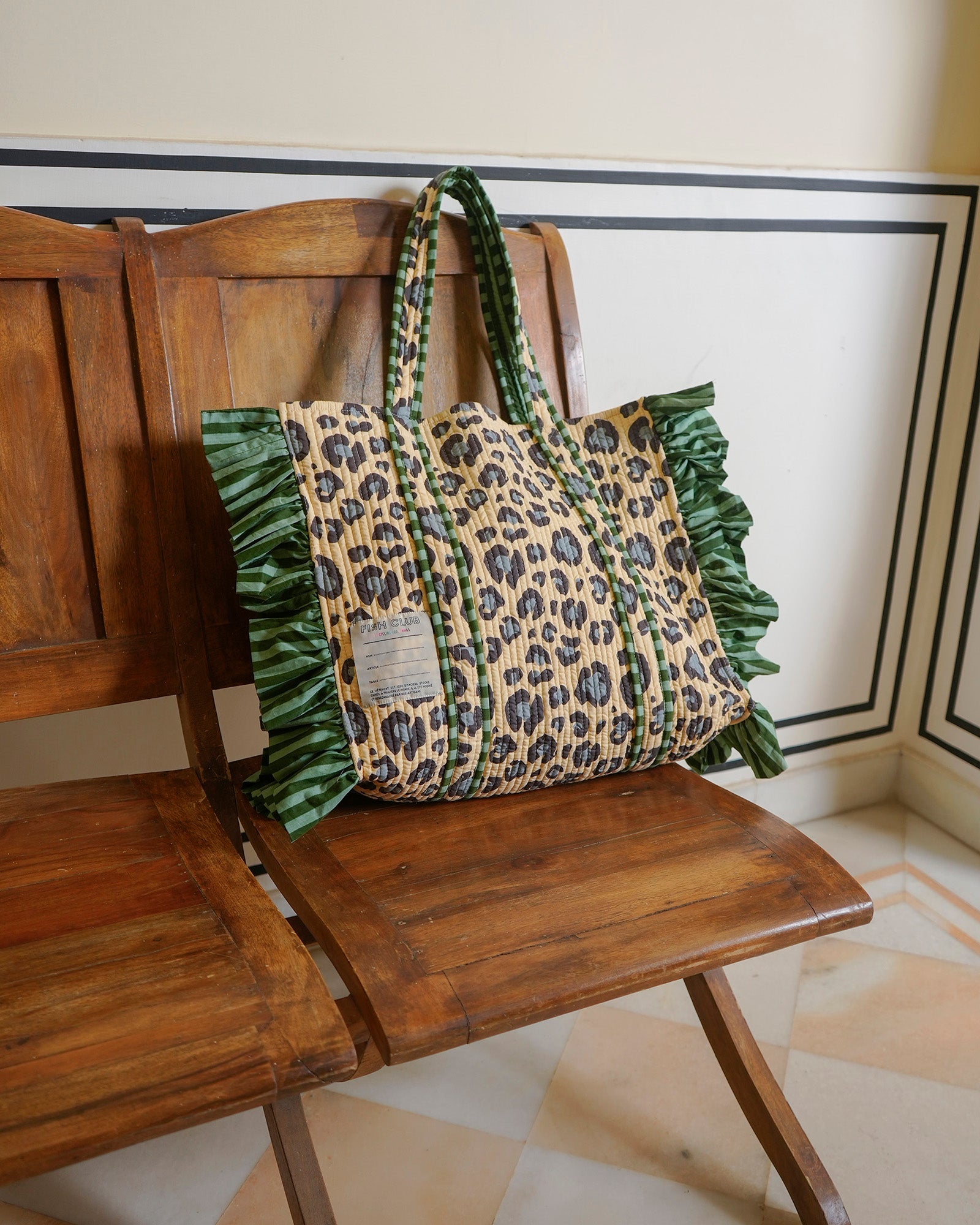 Grand cabas en coton patchwork surpiqué, froufrou motif léopard avec poche intérieure et pochette détachable.