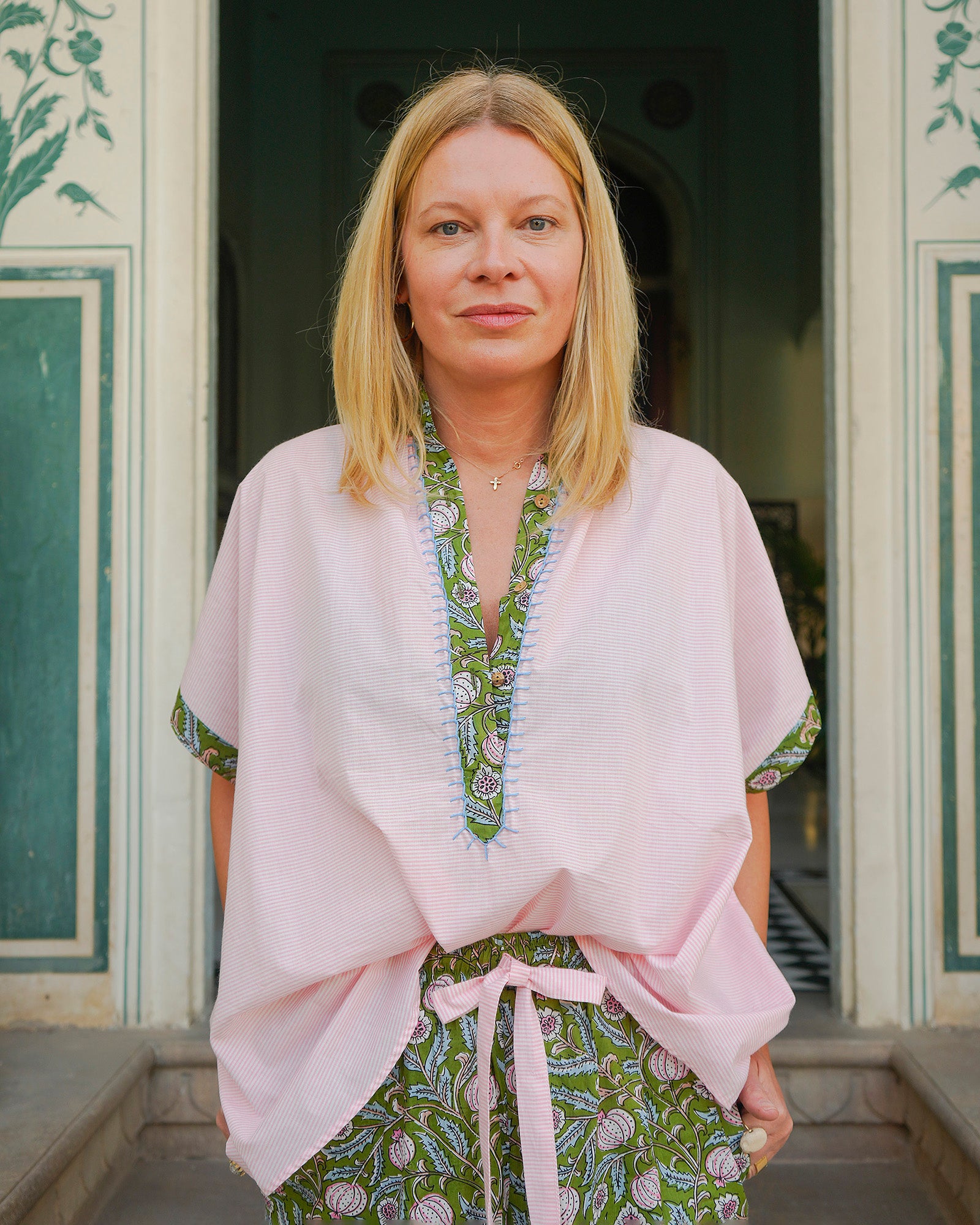 Chemise oversize sans manches en coton à rayures rose pâle, col rond à motif fleurs, brodée à la main à Paris.