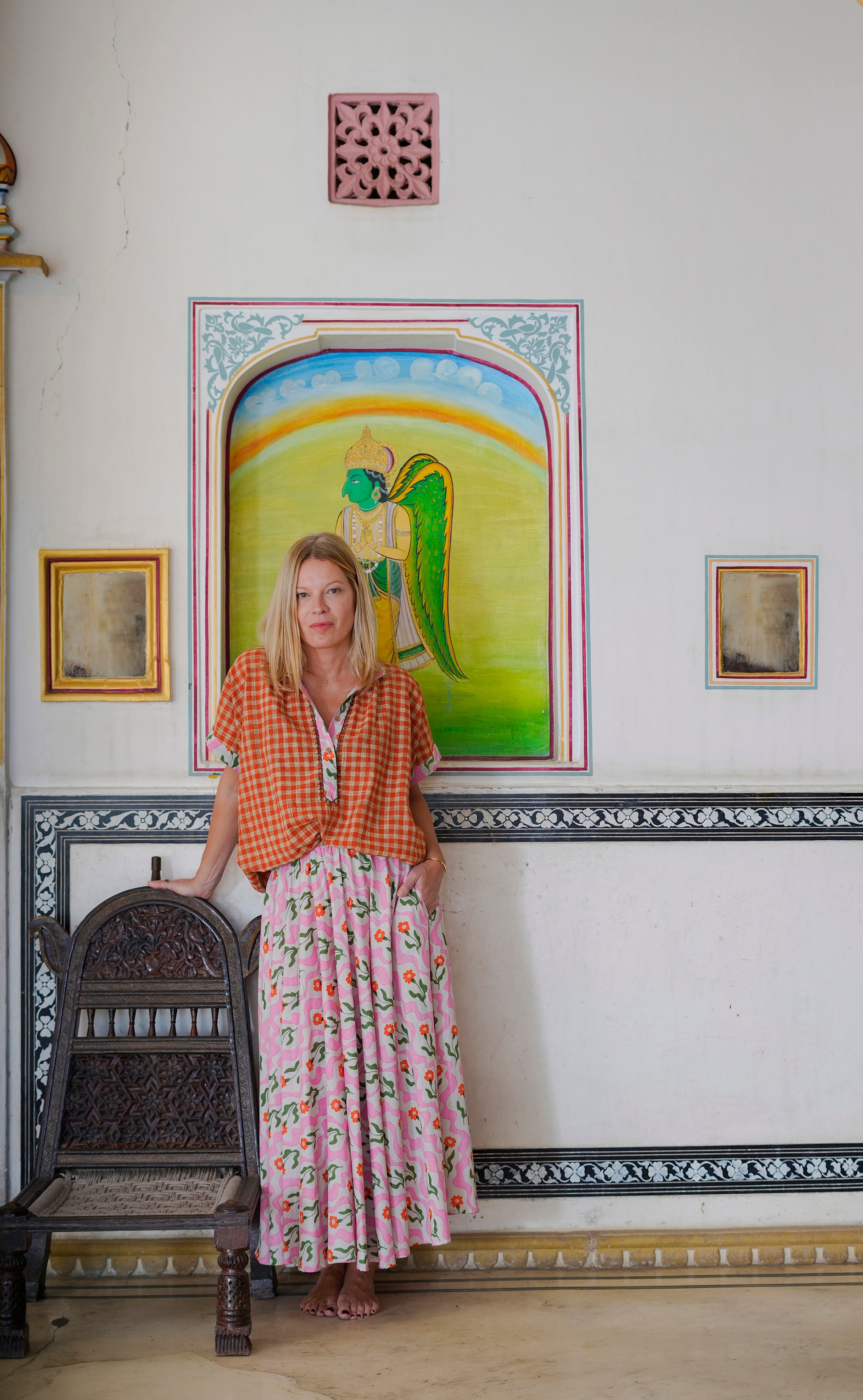 Chemise oversize sans manches en lin à carreaux, col rond à fleurs, brodée à la main à Paris.