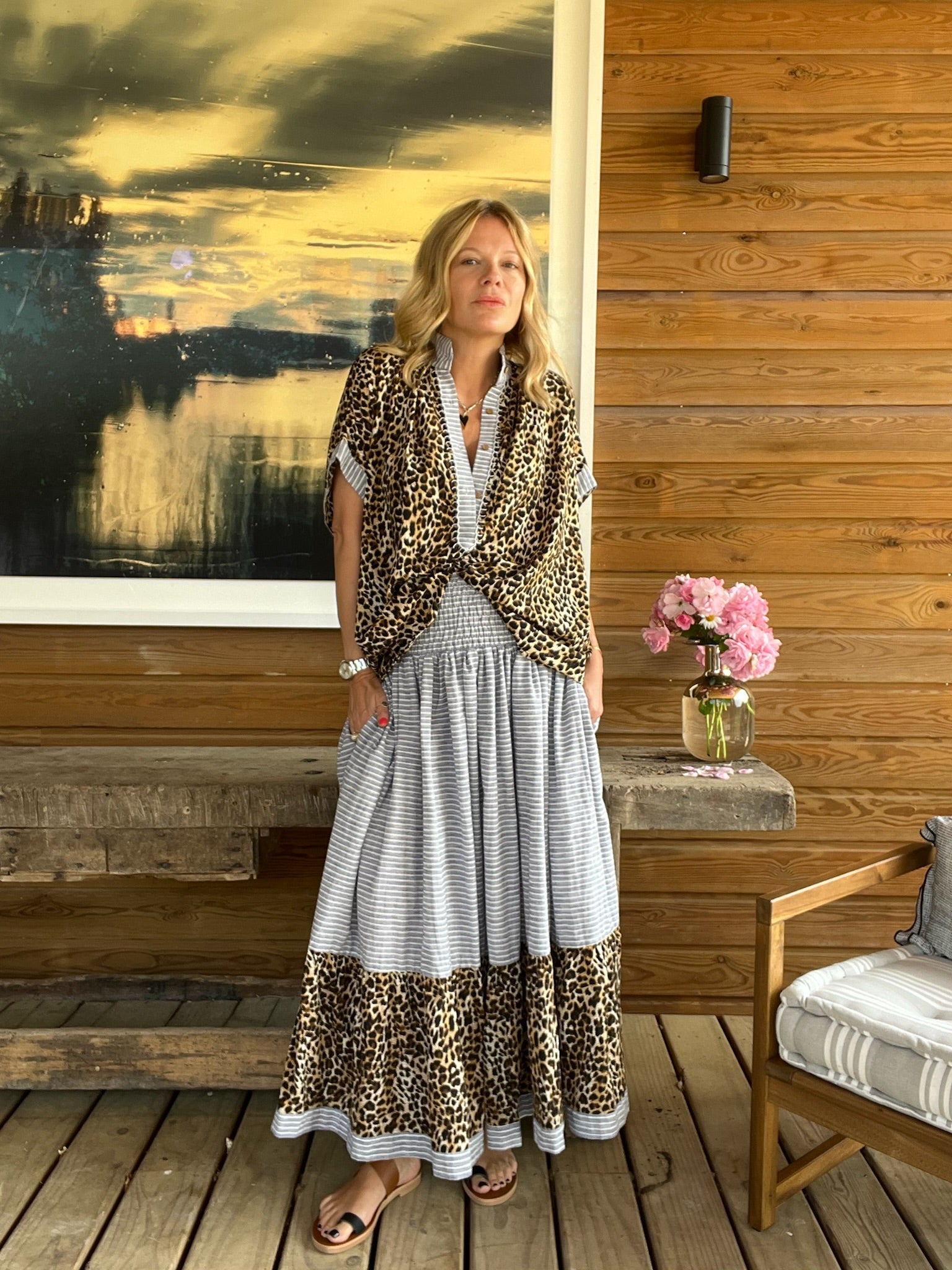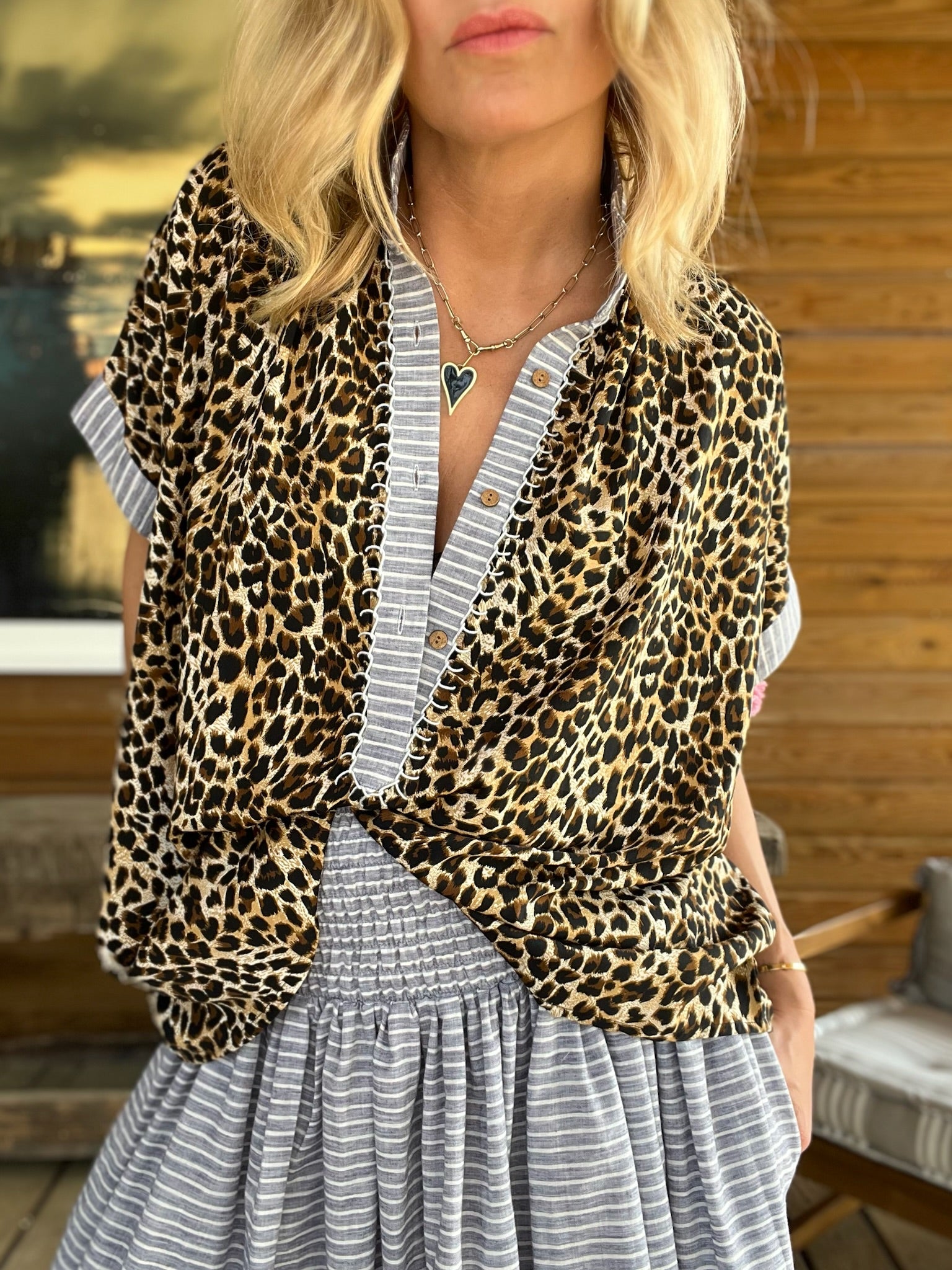Oversize sleeveless shirt, leopard viscose, a rounded striped cotton neck, hand embroidered in Paris.