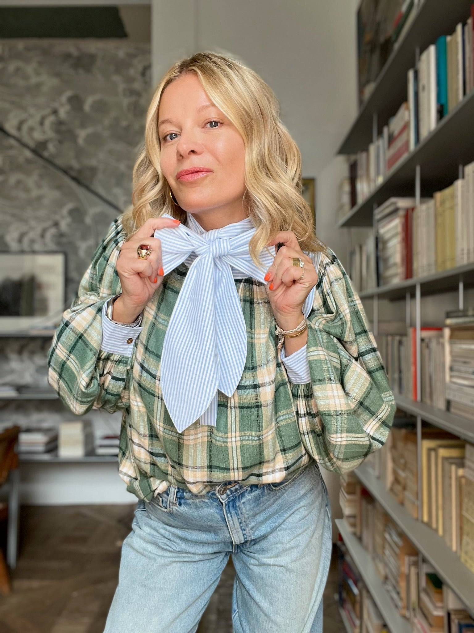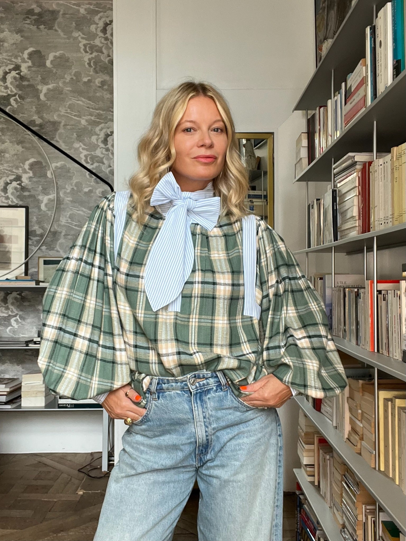 Blouse en twill à carreaux vert d'eau et empiècement de coton à rayures, manches bouffantes et noeud amovible.