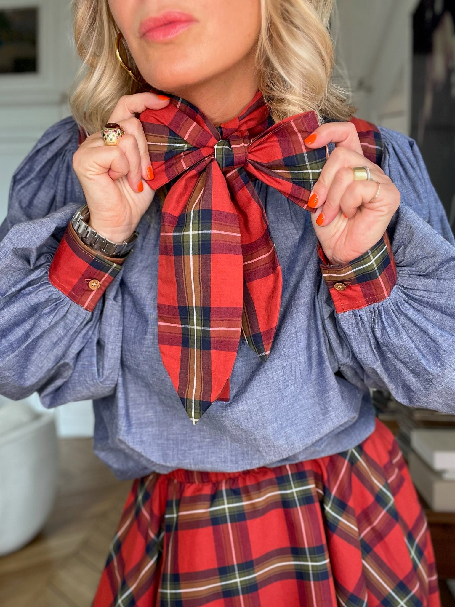 Blouse en coton bleu et empiècement de coton coloré, manches bouffantes et noeud amovible.