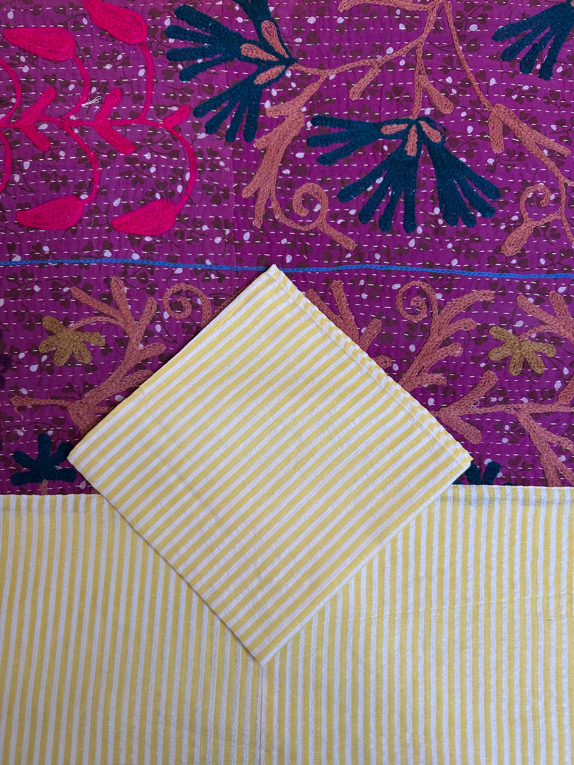 Exceptional ensemble composed of a large tablecloth + 8 matching towels associating Kantha Old Re-Brodé by hand with one of our iconic fabrics.