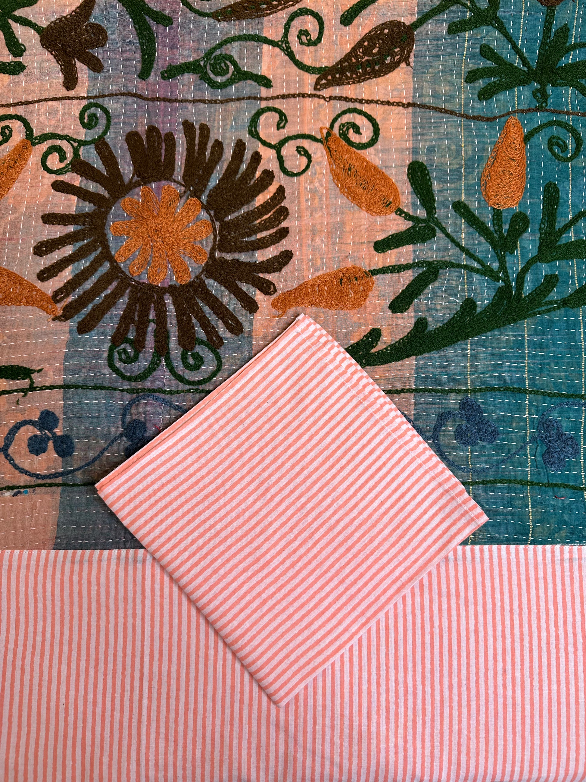 Exceptional ensemble composed of a large tablecloth + 8 matching towels associating Kantha Old Re-Brodé by hand with one of our iconic fabrics.