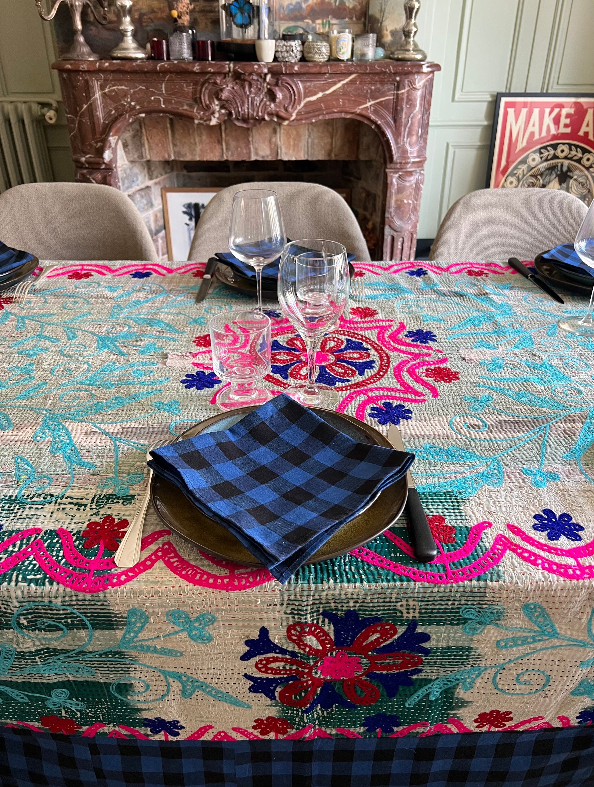 Exceptional ensemble composed of a large tablecloth + 8 matching towels associating Kantha Old Re-Brodé by hand with one of our iconic fabrics.