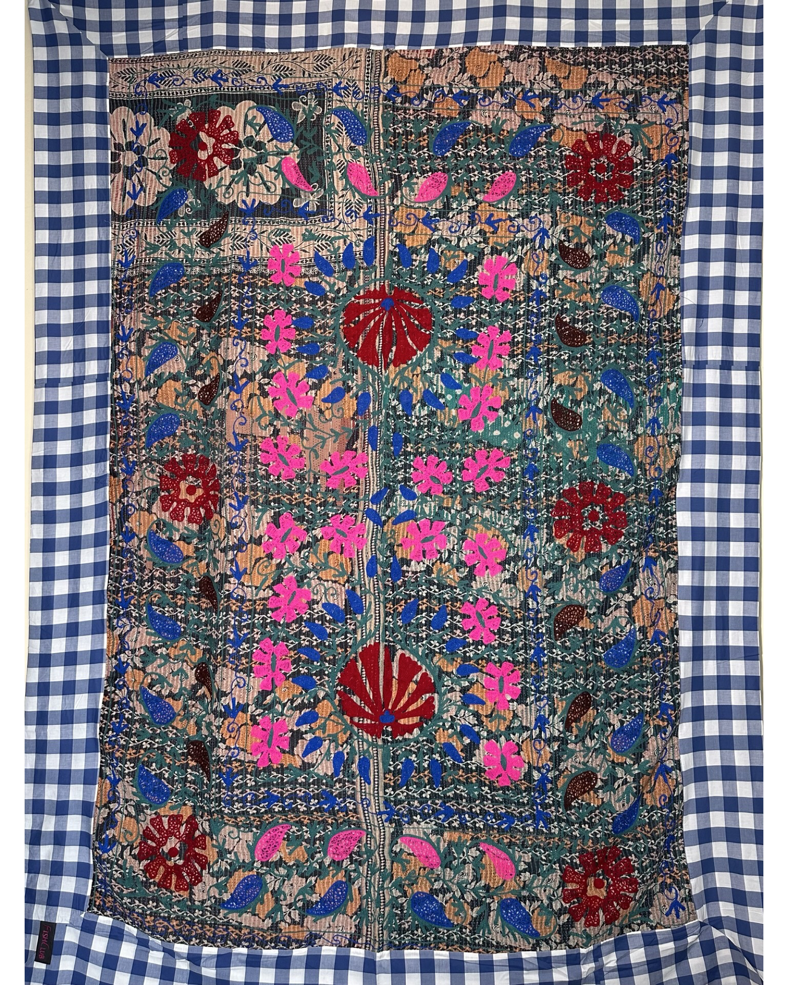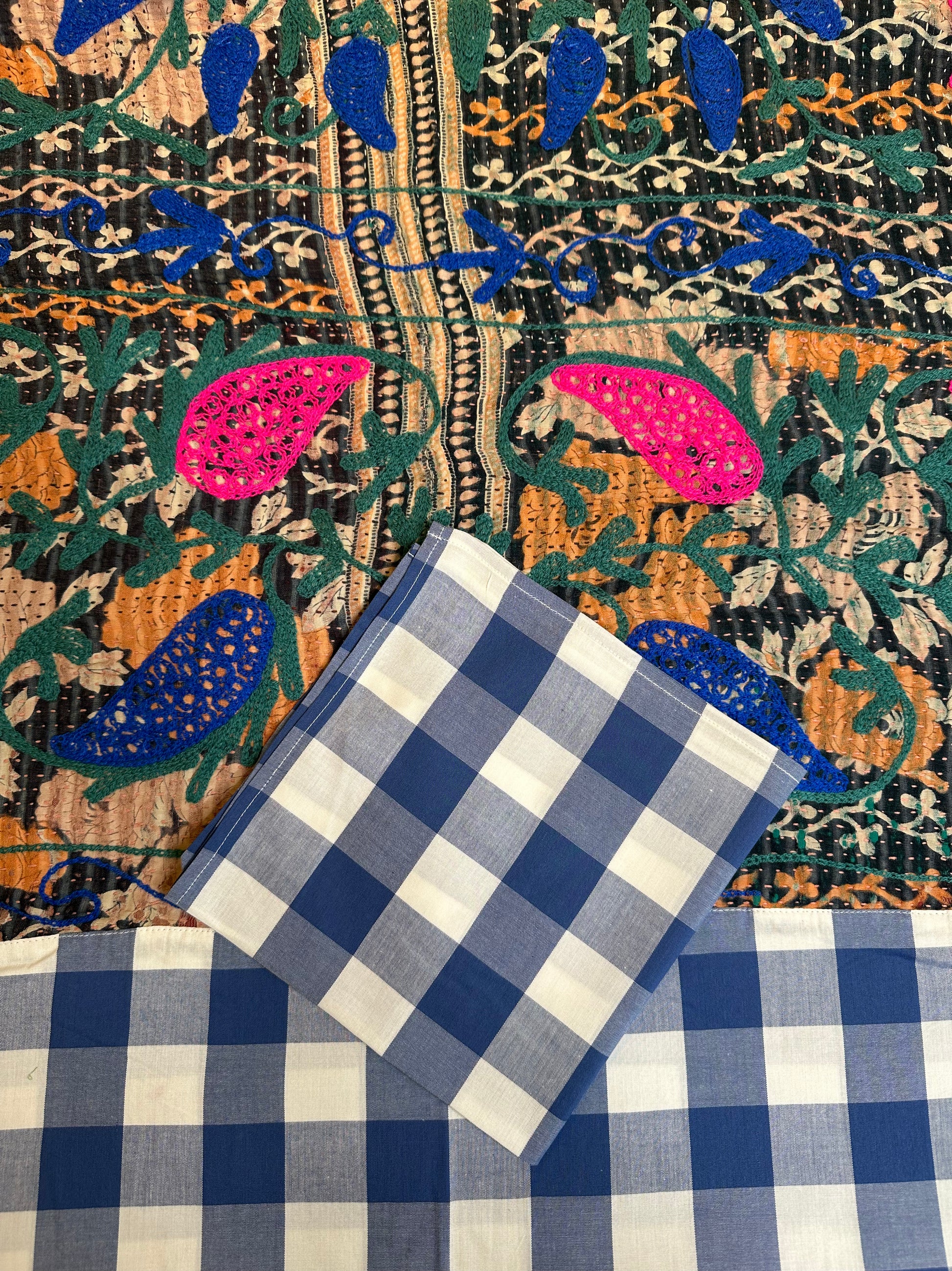 Exceptional ensemble composed of a large tablecloth + 8 matching towels associating Kantha Old Re-Brodé by hand with one of our iconic fabrics.