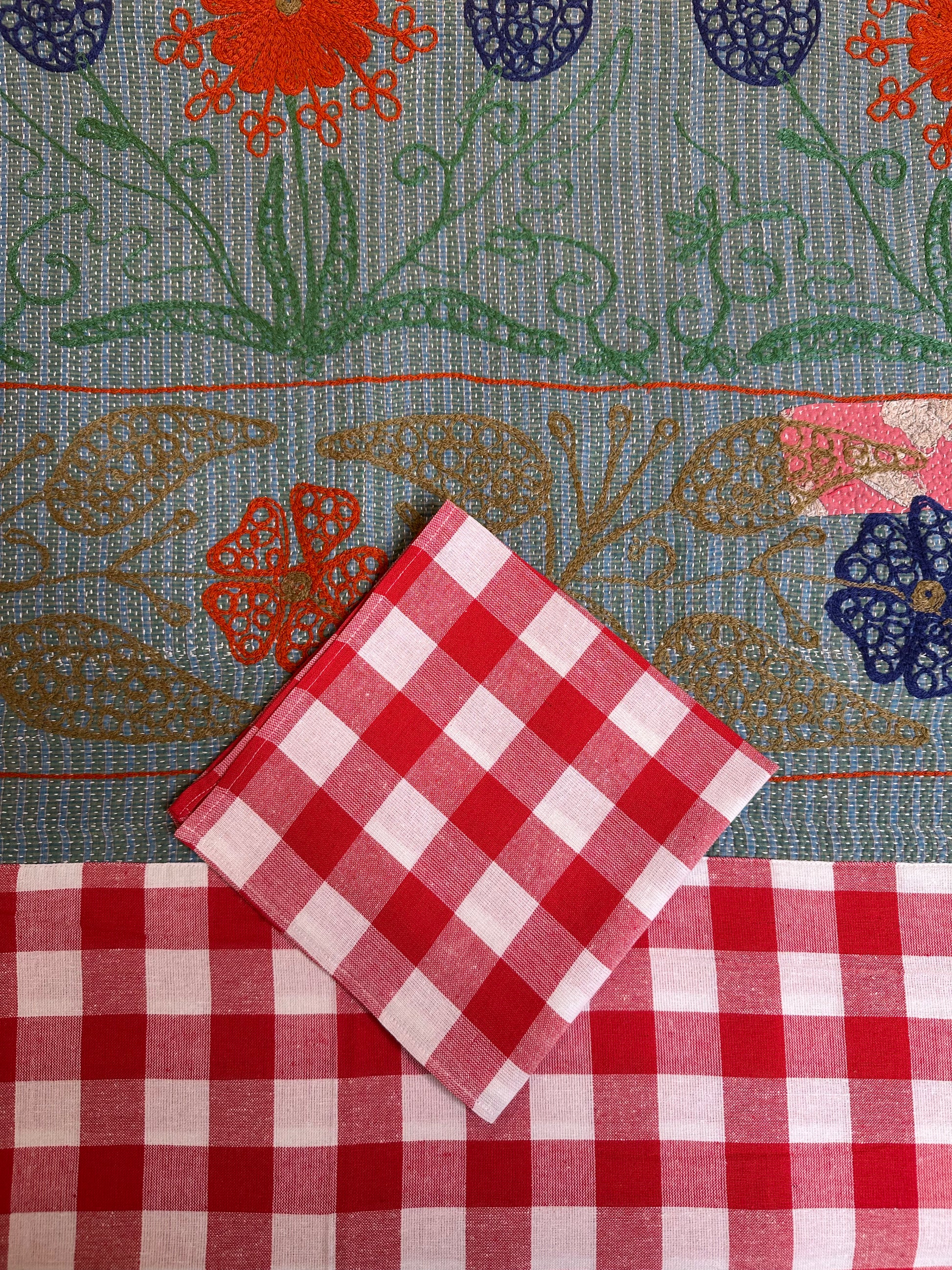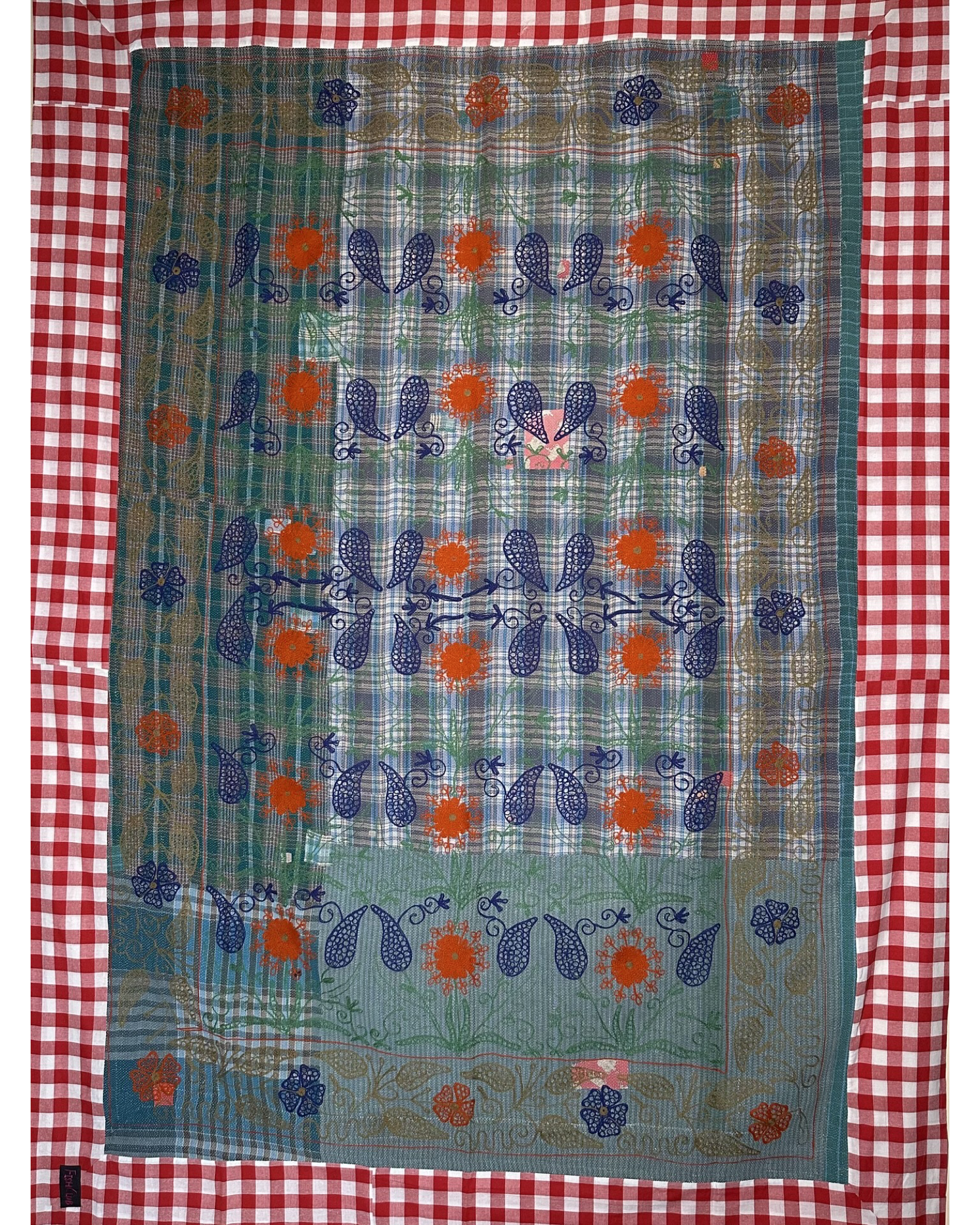 Exceptional ensemble composed of a large tablecloth + 8 matching towels associating Kantha Old Re-Brodé by hand with one of our iconic fabrics.