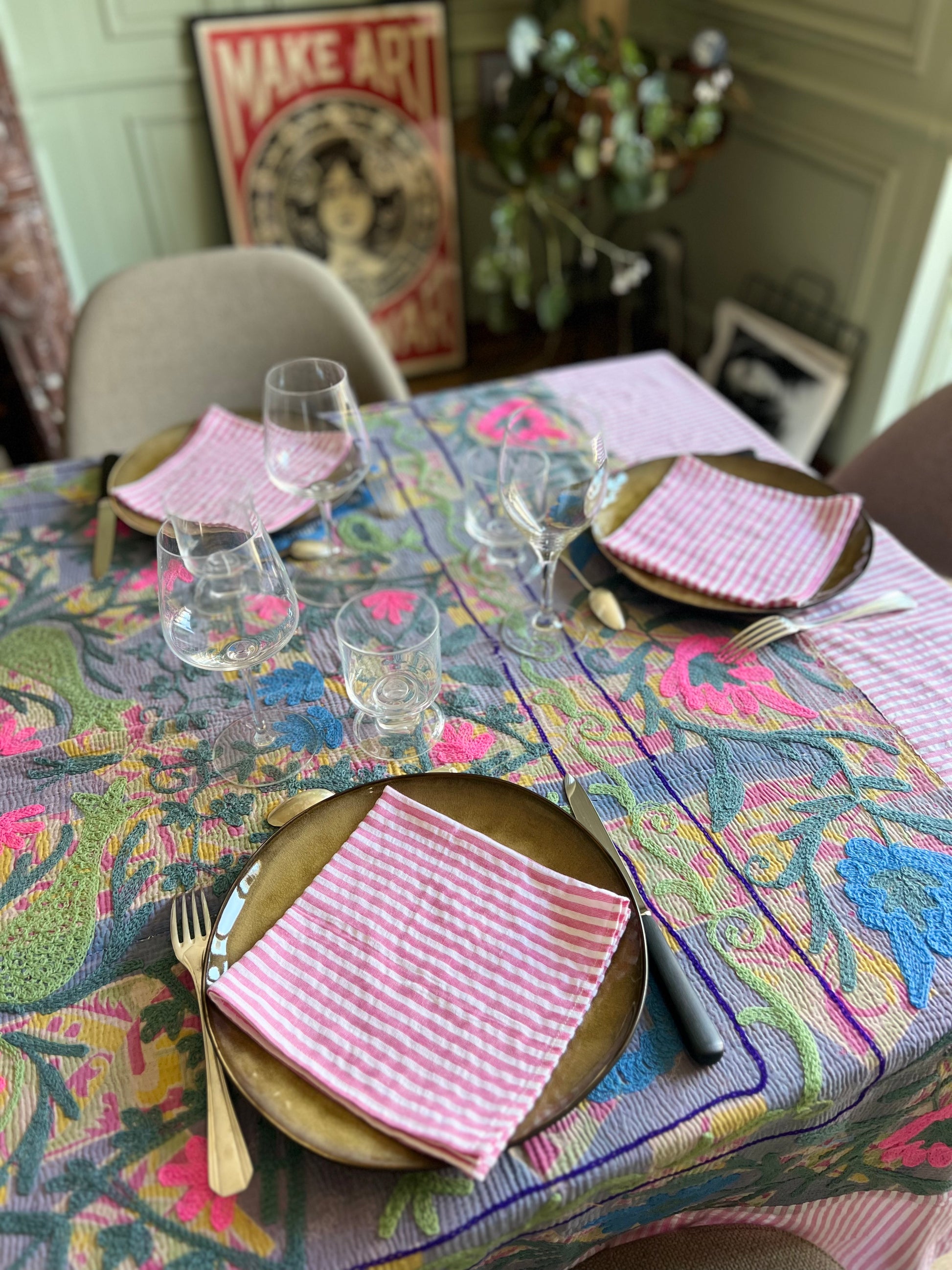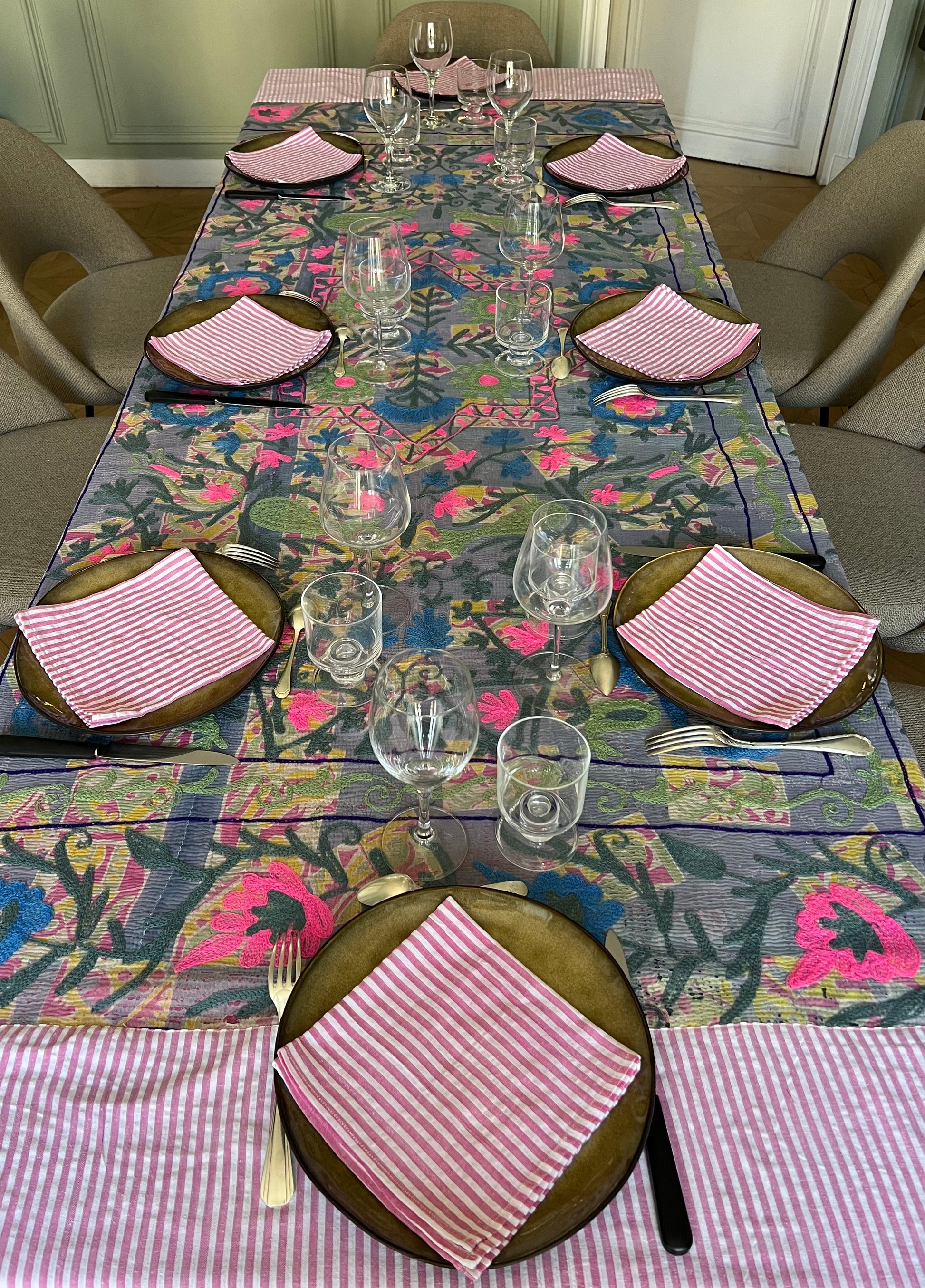 Exceptional ensemble composed of a large tablecloth + 8 matching towels associating Kantha Old Re-Brodé by hand with one of our iconic fabrics.