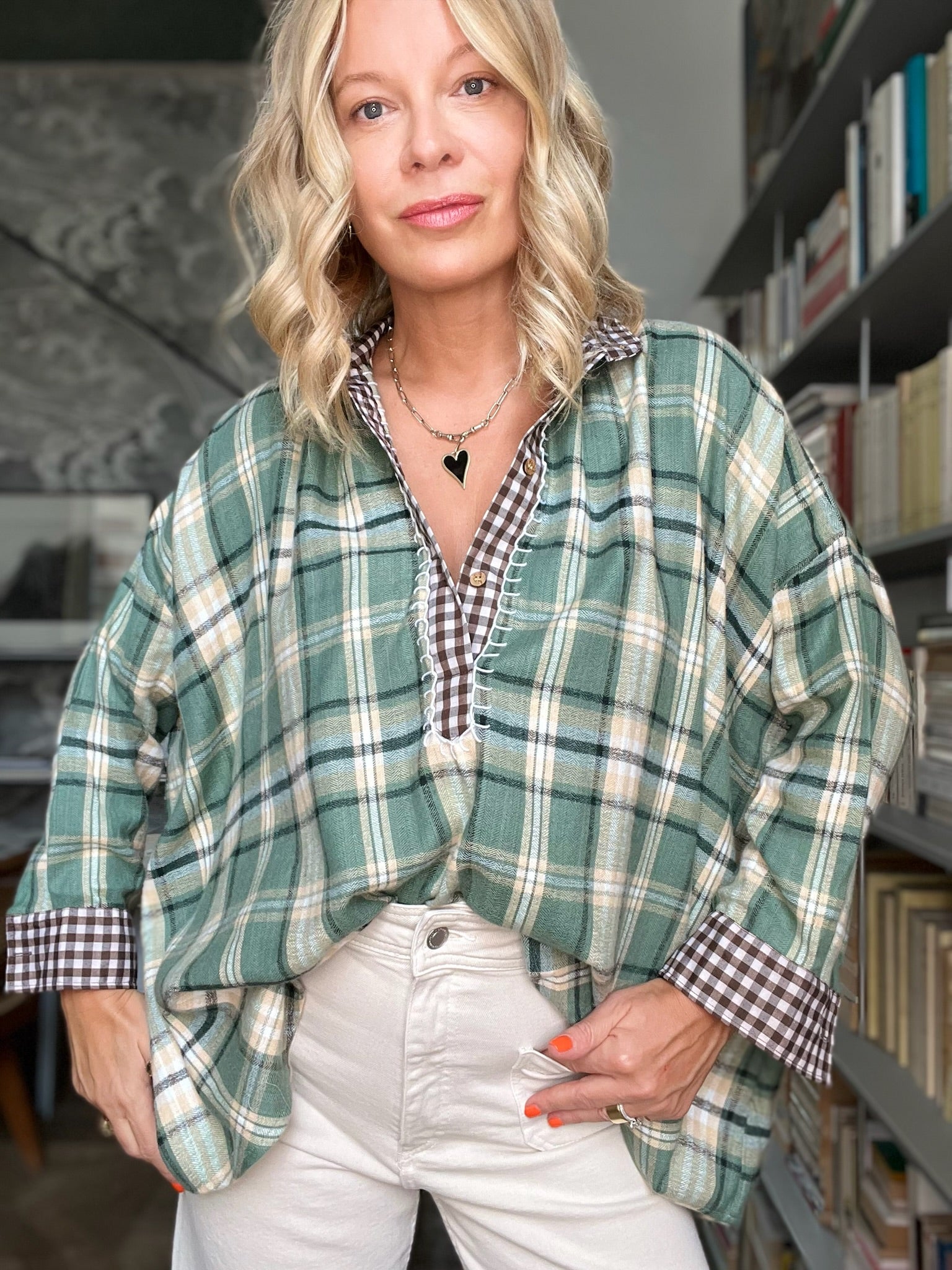 Oversize twill shirt, water green tiles, gray round neck, 3/4 cotton sleeves, hand embroidered in Paris.