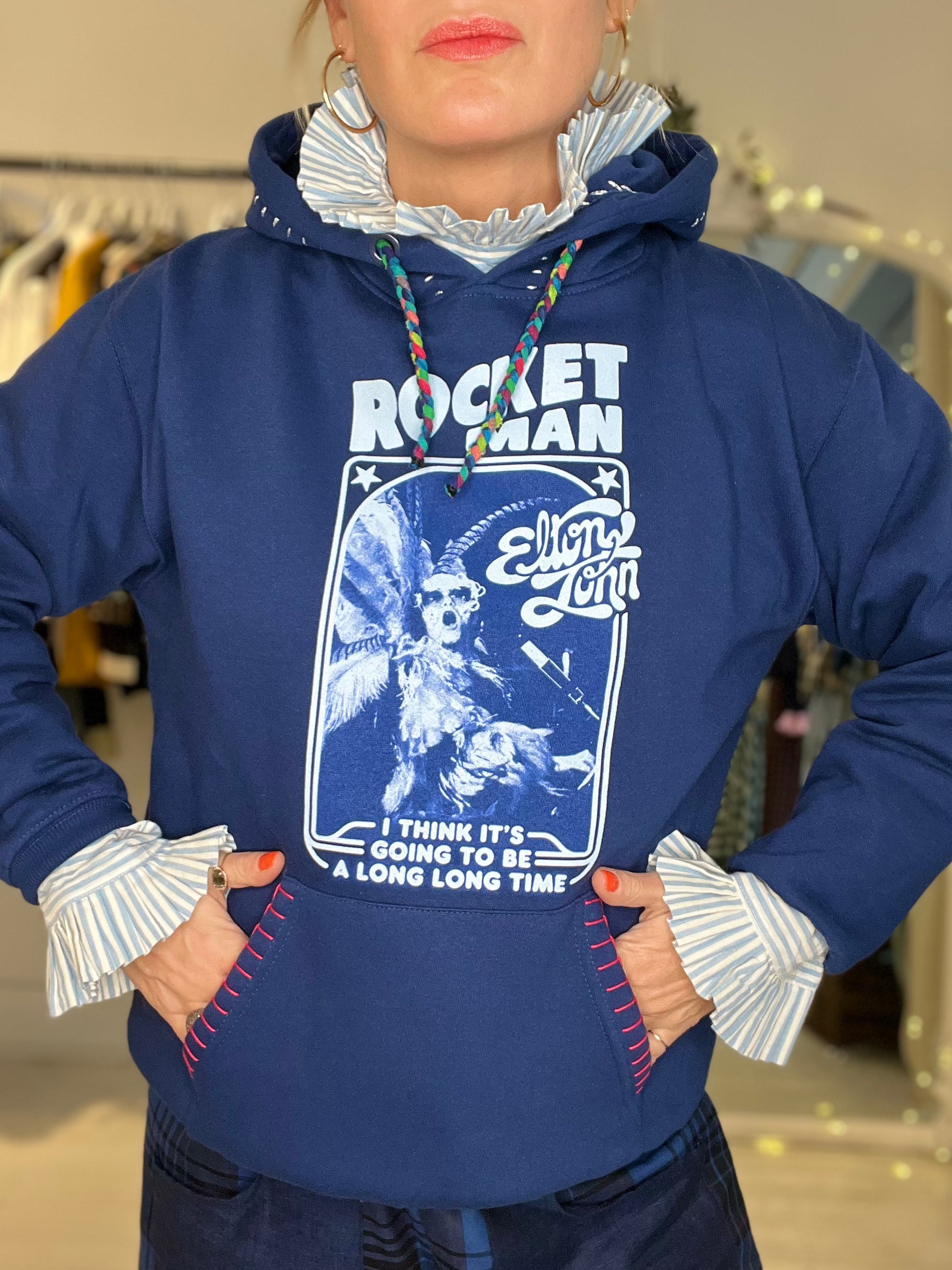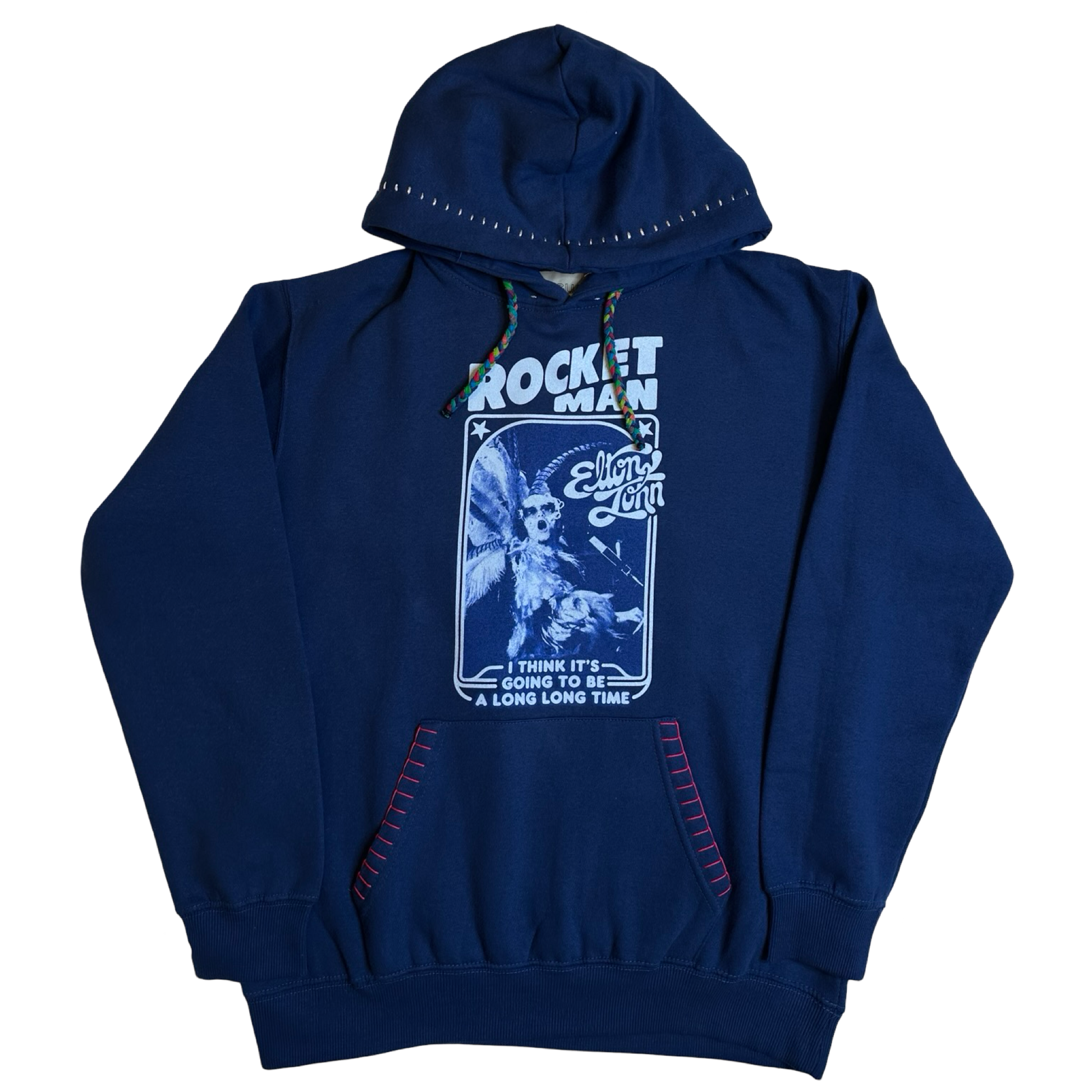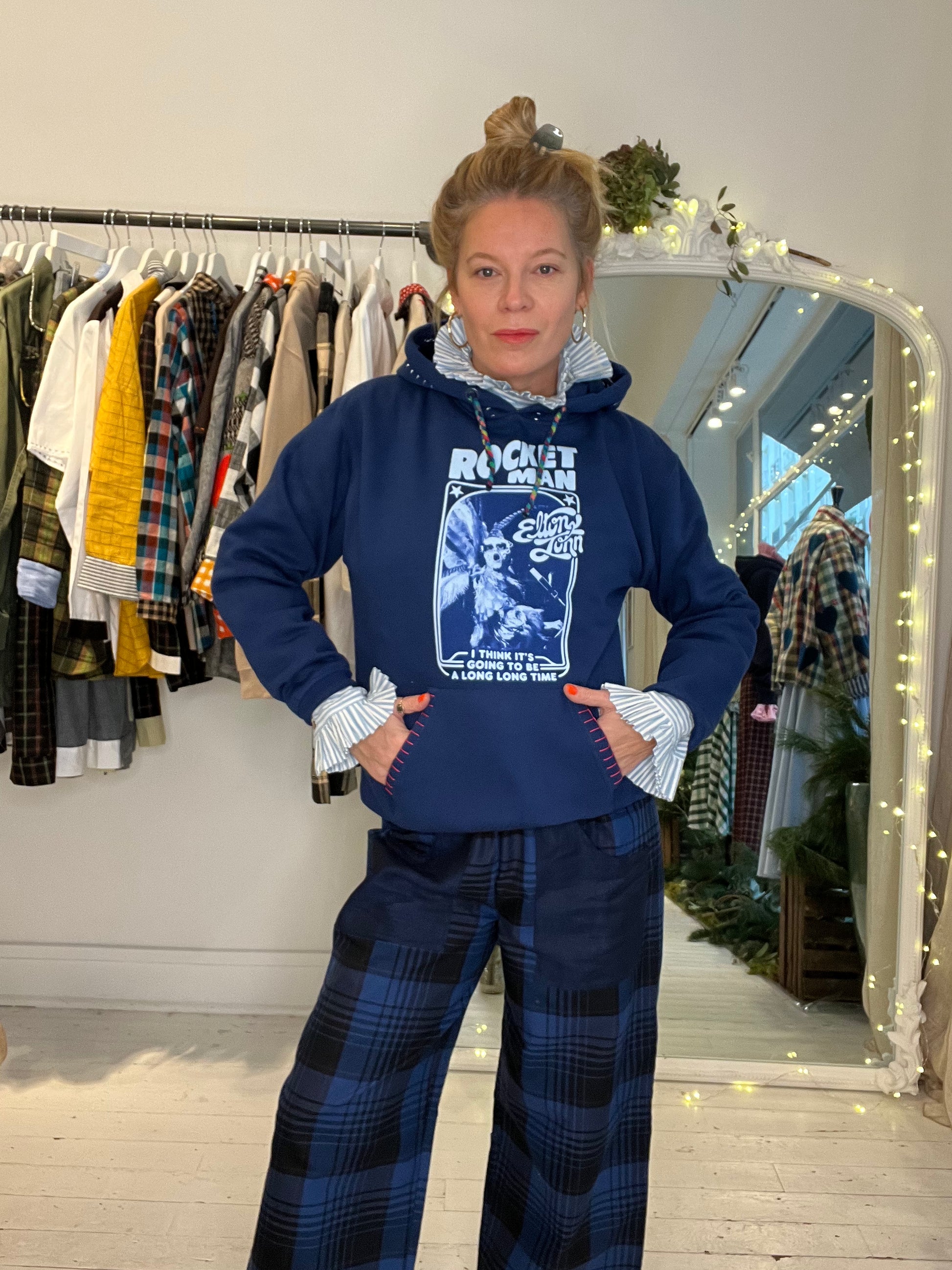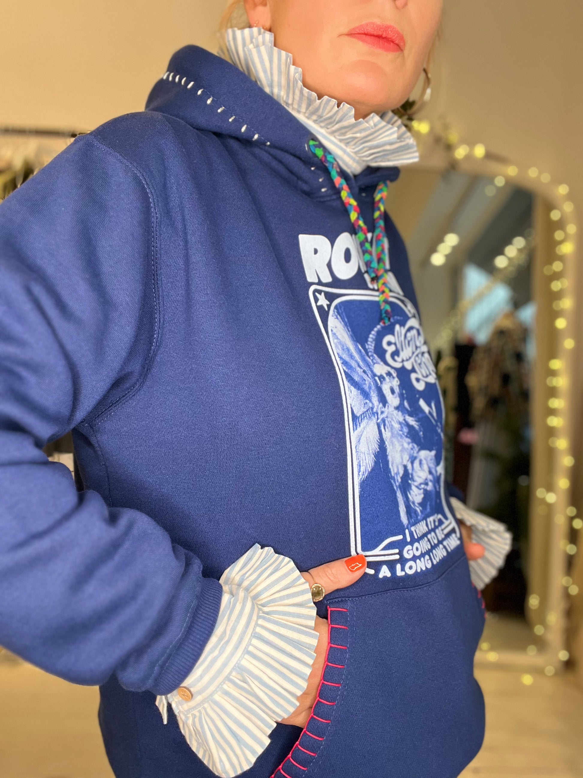 HOODIE BLEU Elton John, in re-work and hand-embroidered cotton in Paris. The tightening link is braided with the tissue falls of our shirts.