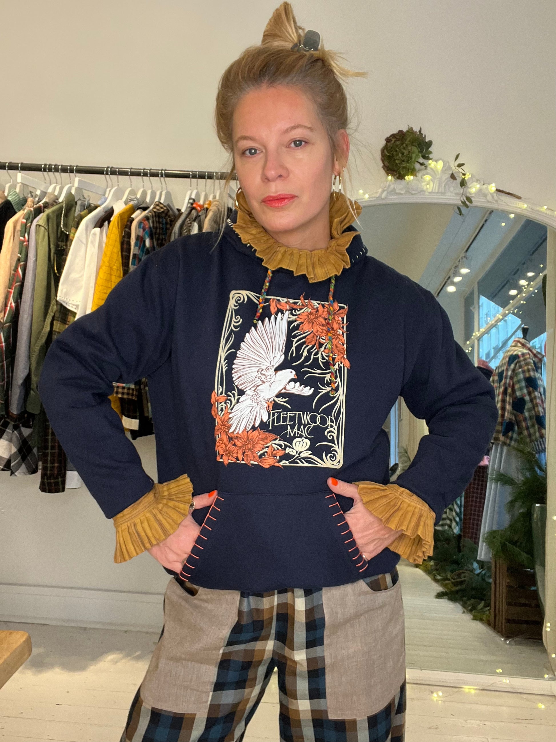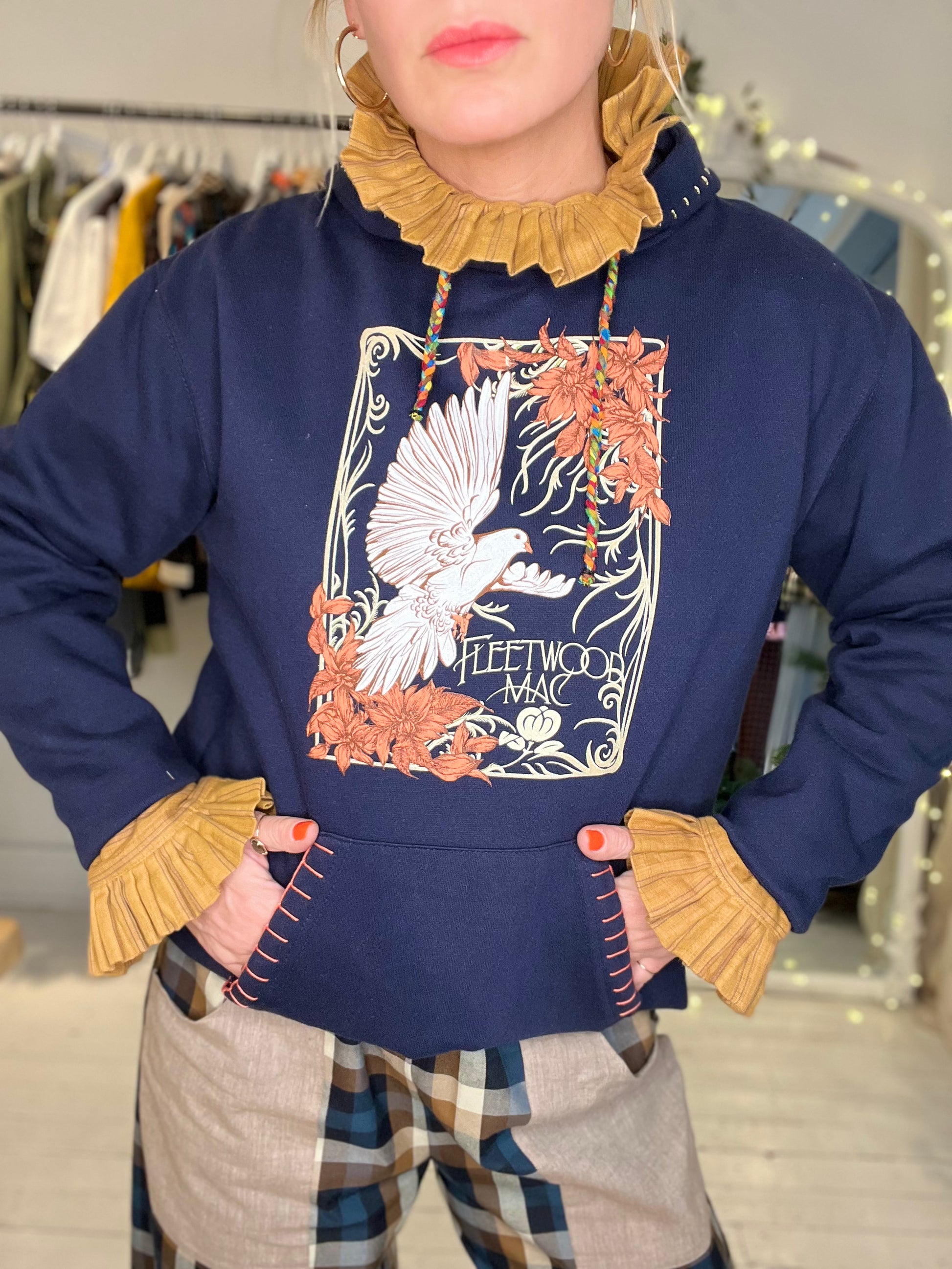 HOODIE Noir Fleetwood Mac, re-working and hand embroidered in Paris. The tightening link is braided with the tissue falls of our shirts.