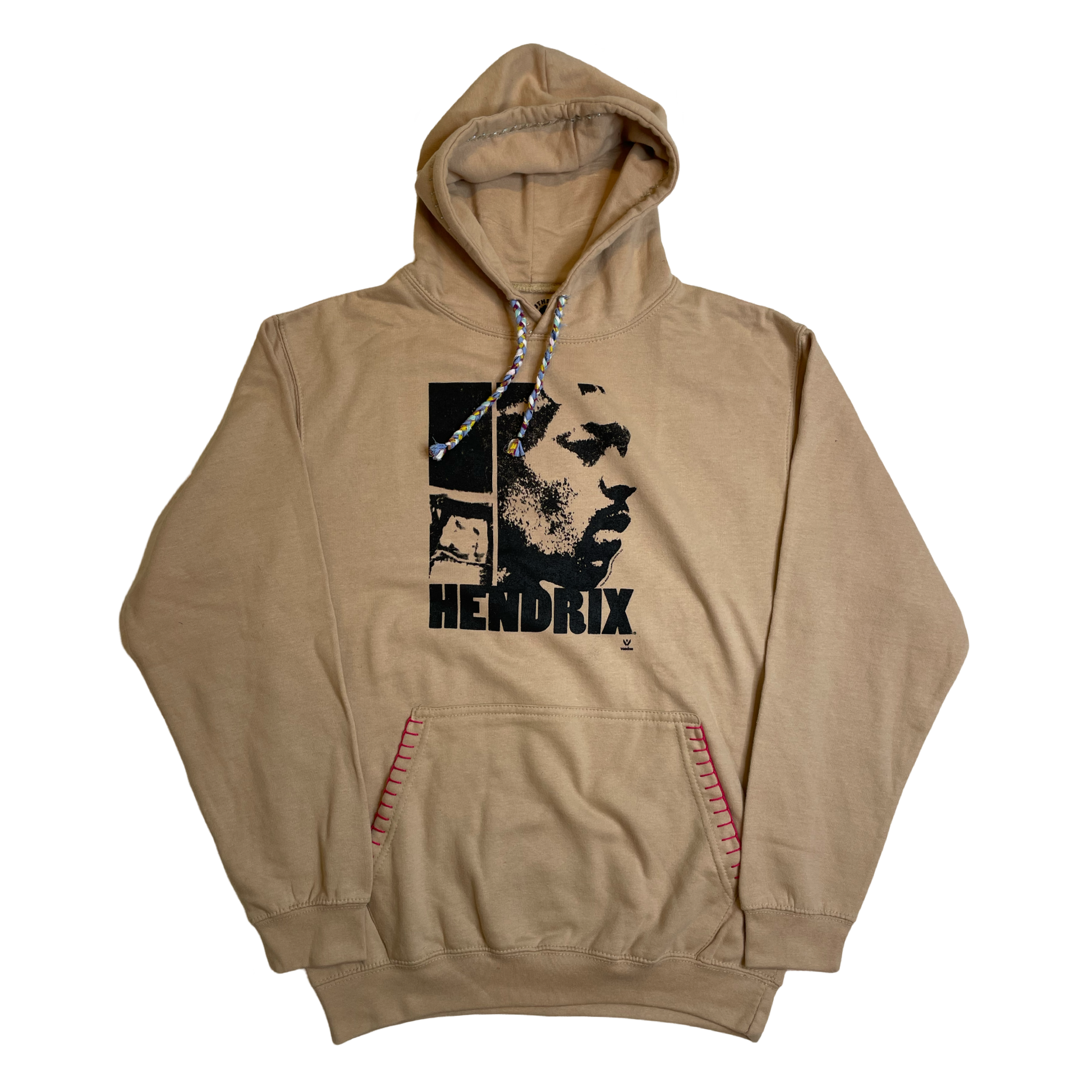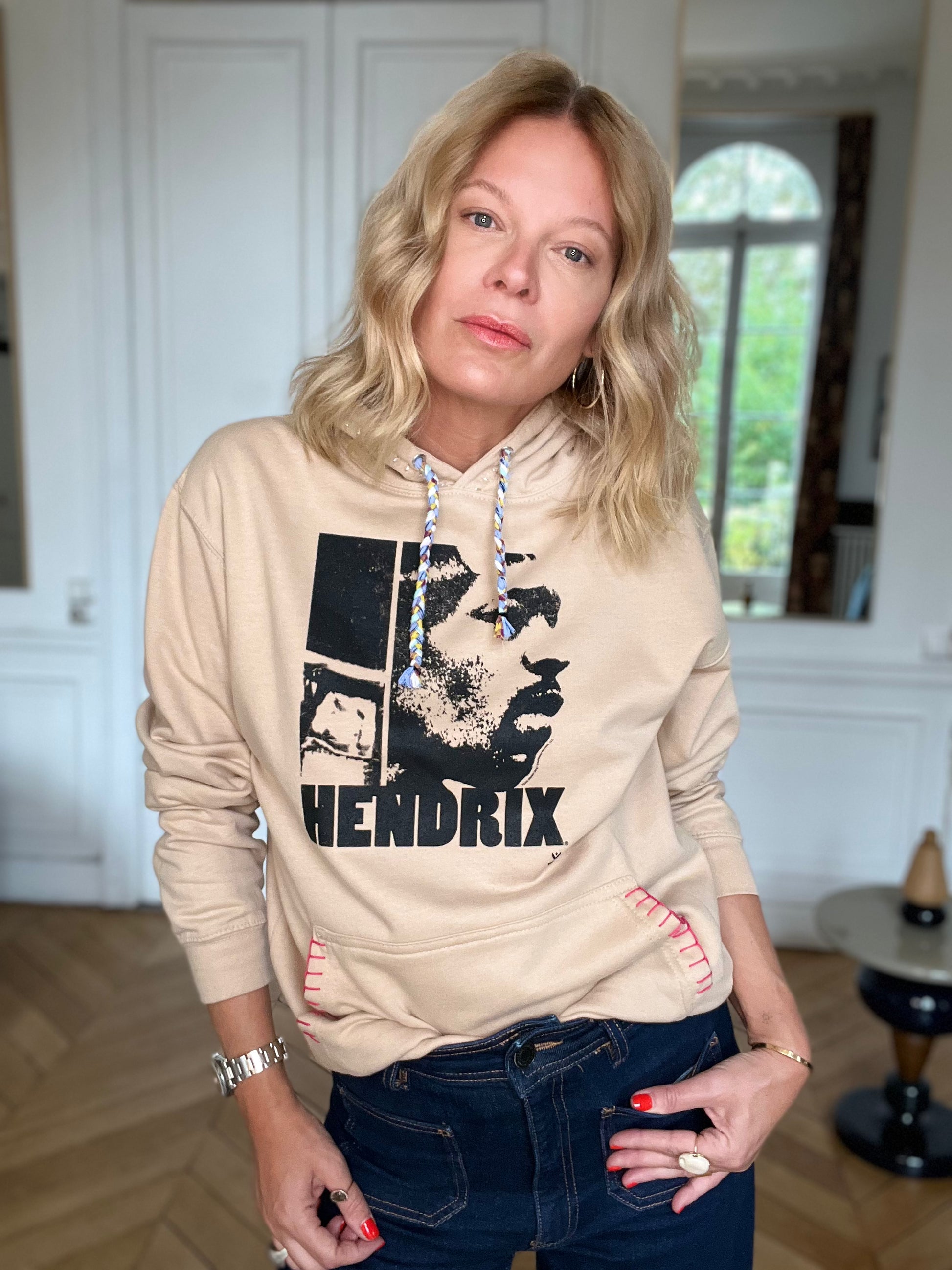 Beige hoodie in cotton re-work and hand embroidered in Paris. The tightening link is braided with the tissue falls of our shirts.