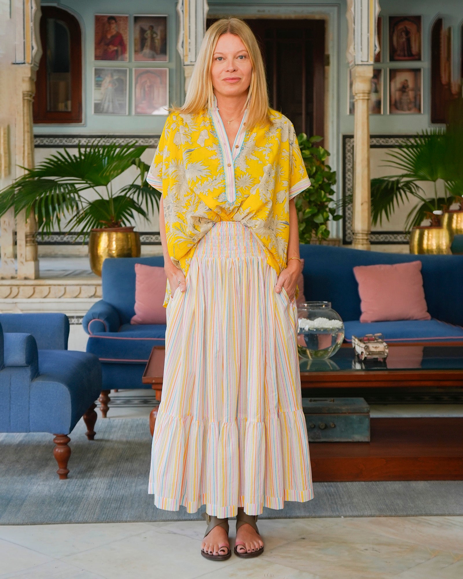 Jupe évasée en coton à rayures, smocks à la taille élastique.