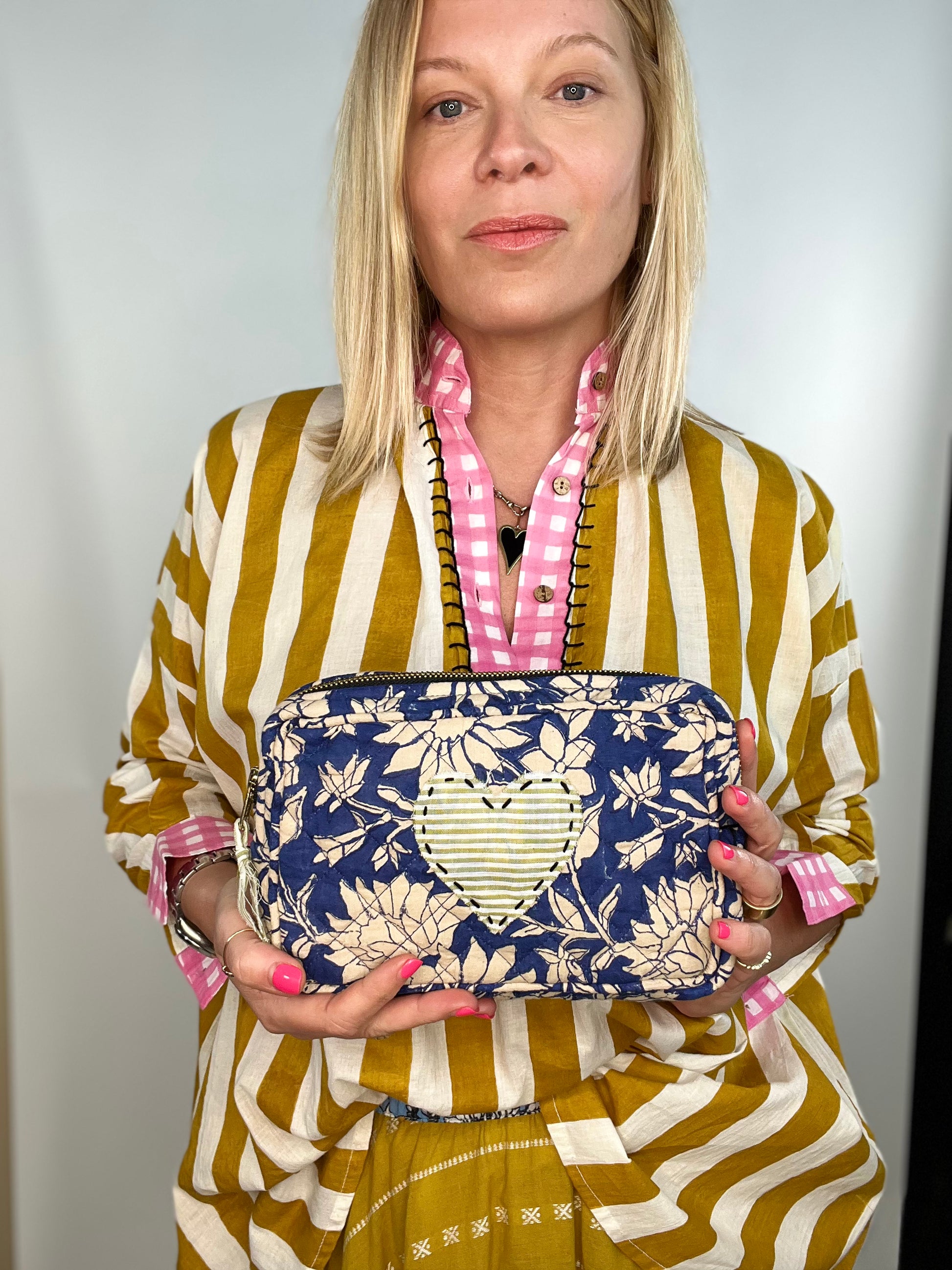 Cutting pocket in Block Print of Blue and Ecru cotton shaped in Jaipur with the falls of our shirts: zipped interior pocket.