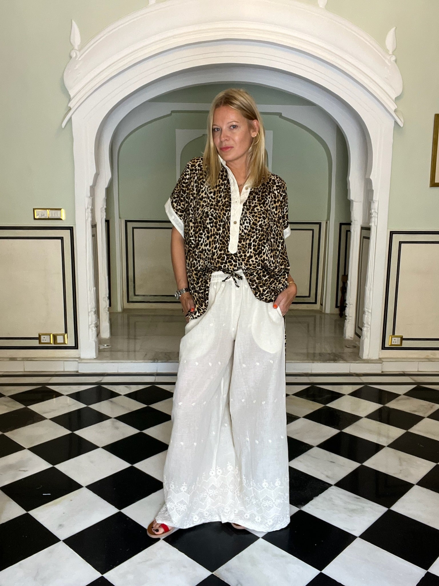 Large and fluid pants, flared cut, elasticated at the waist with tightening link, pockets and strips on the sides.