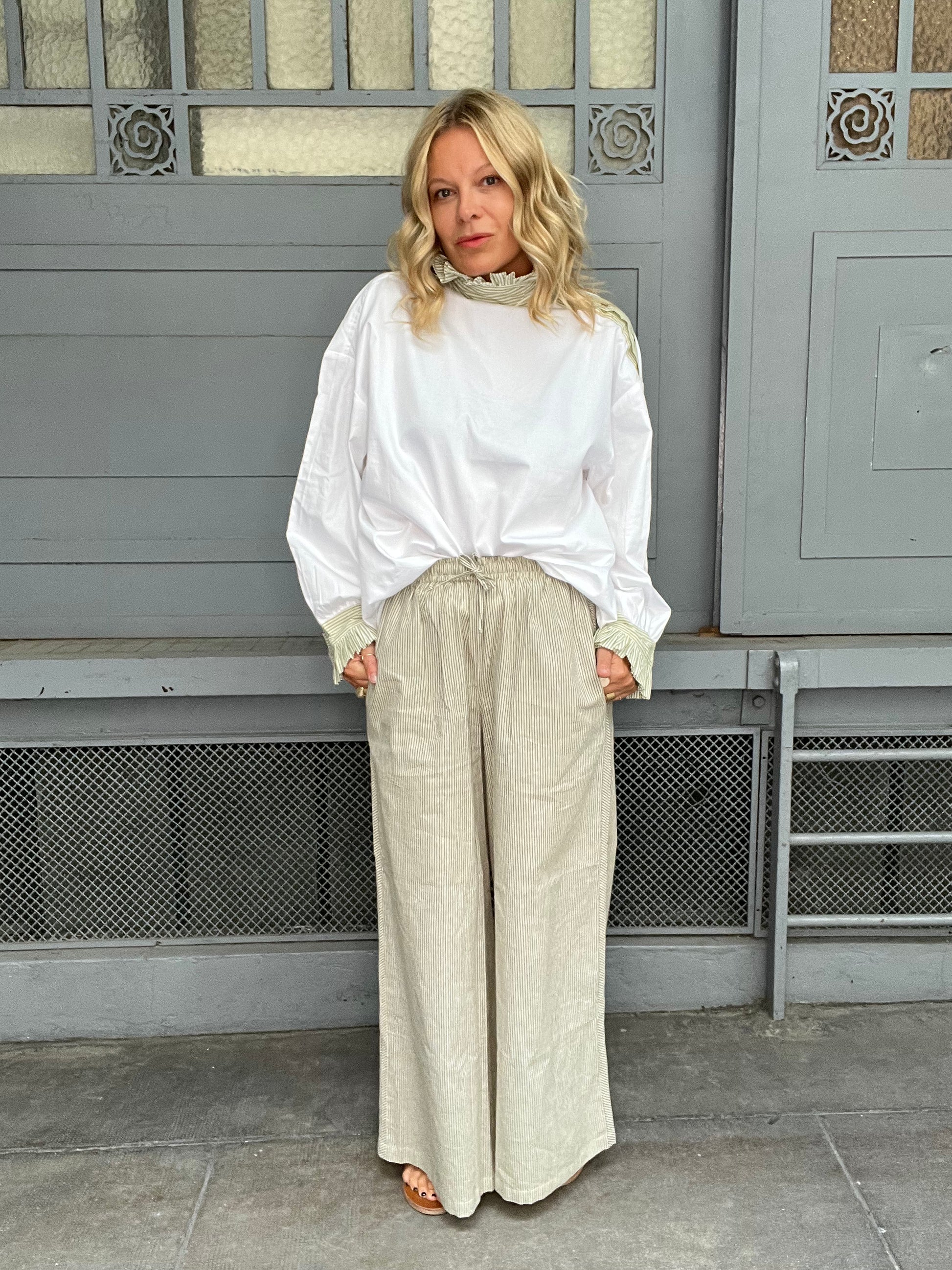 Large and fluid pants, flared cut, elasticated at the waist with tightening link, pockets and strips on the sides.