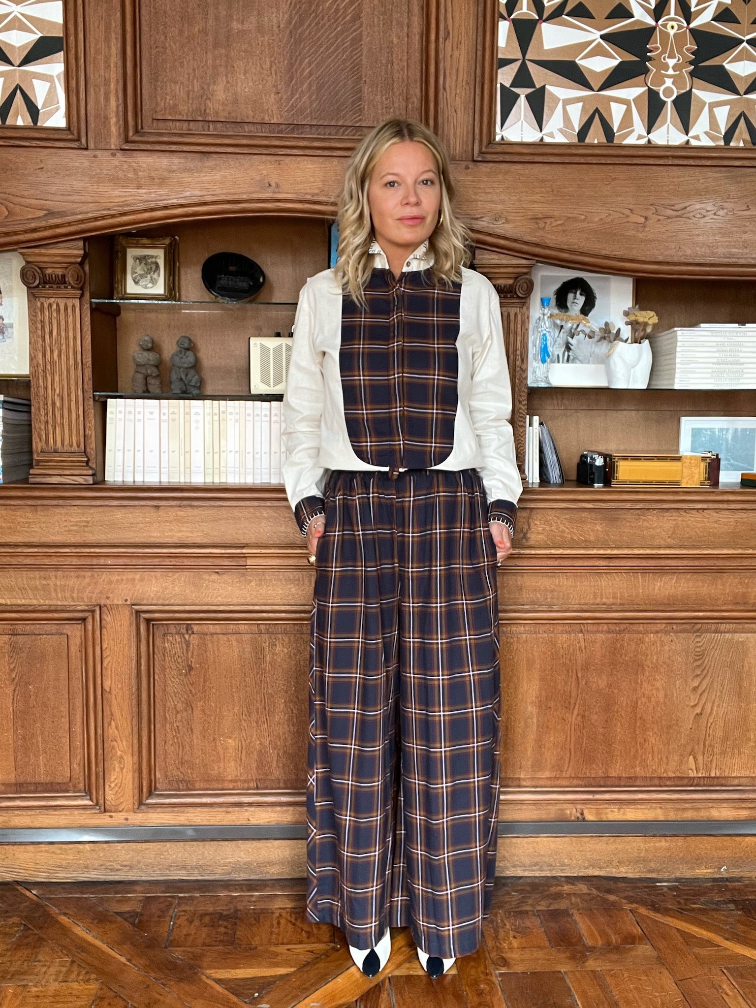Large and fluid pants, flared cut, elasticated at the waist with tightening link, pockets and strips on the sides.