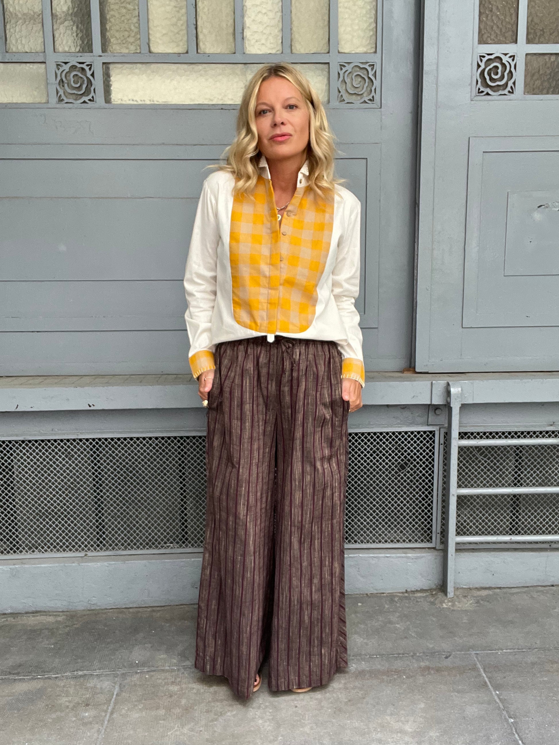 Large and fluid pants, flared cut, elasticated at the waist with tightening link, pockets and strips on the sides.