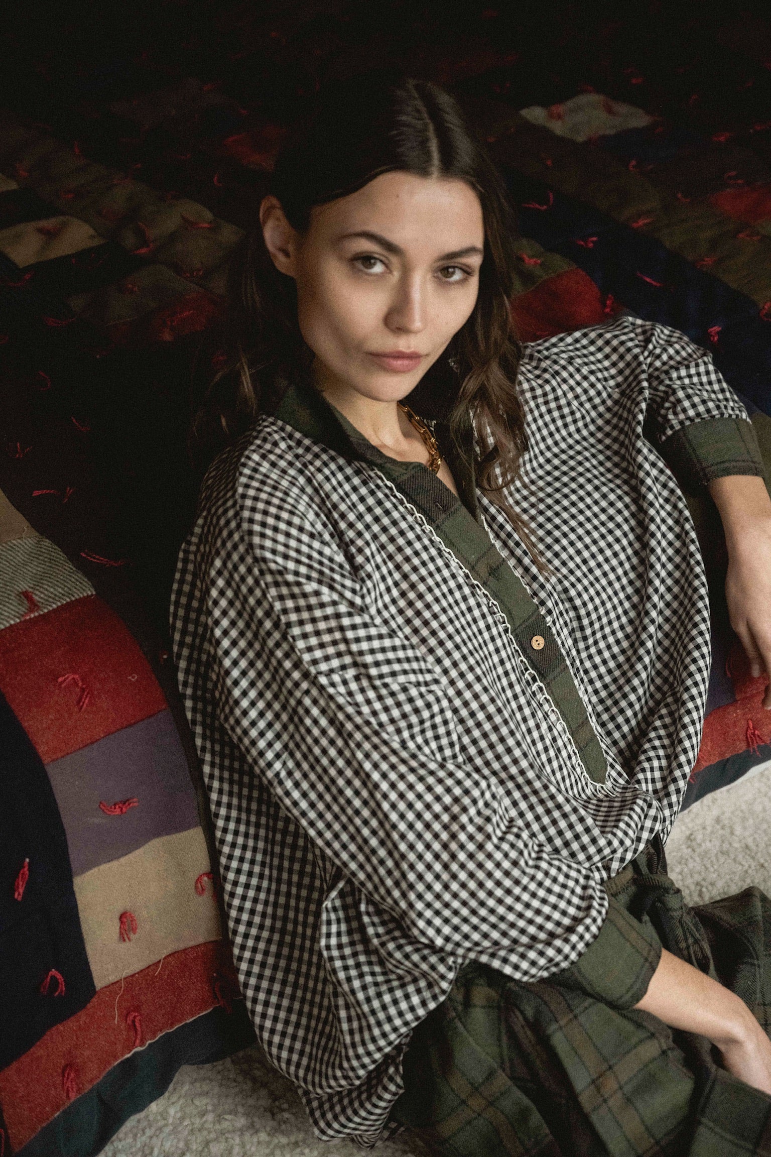 Oversized white and black gingham check shirt, green check round neck, 3/4 sleeves, hand embroidered in Paris.