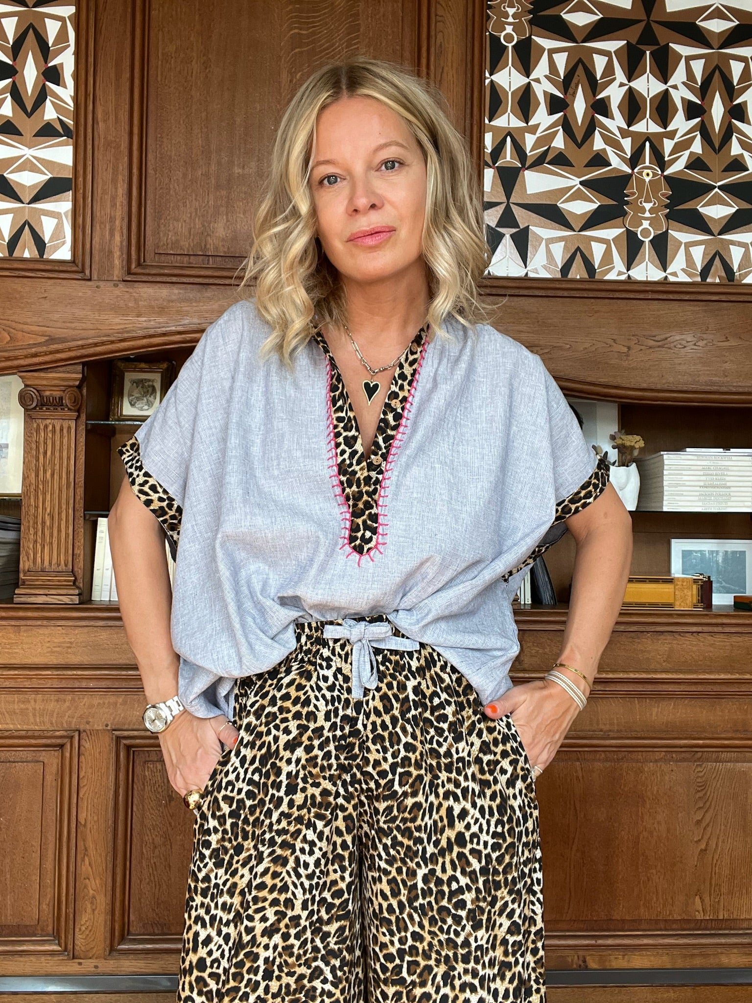 Oversize sleeveless cotton sleeve shirt, multicolored tiles, green checkered round, hand -embroidered in Paris.