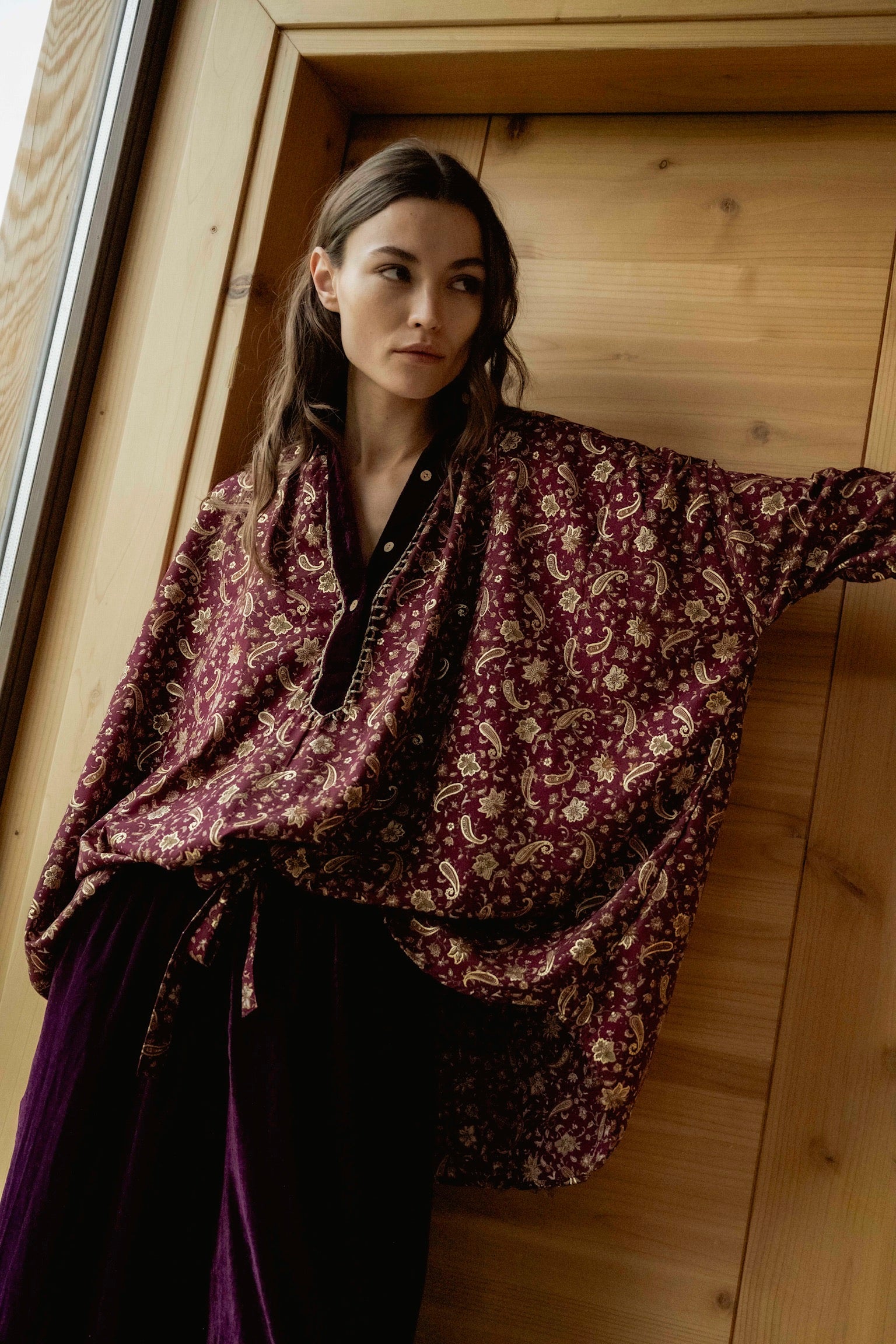 Oversized floral shirt with a round collar in purple velvet, 3/4 sleeves, hand embroidered in Paris.