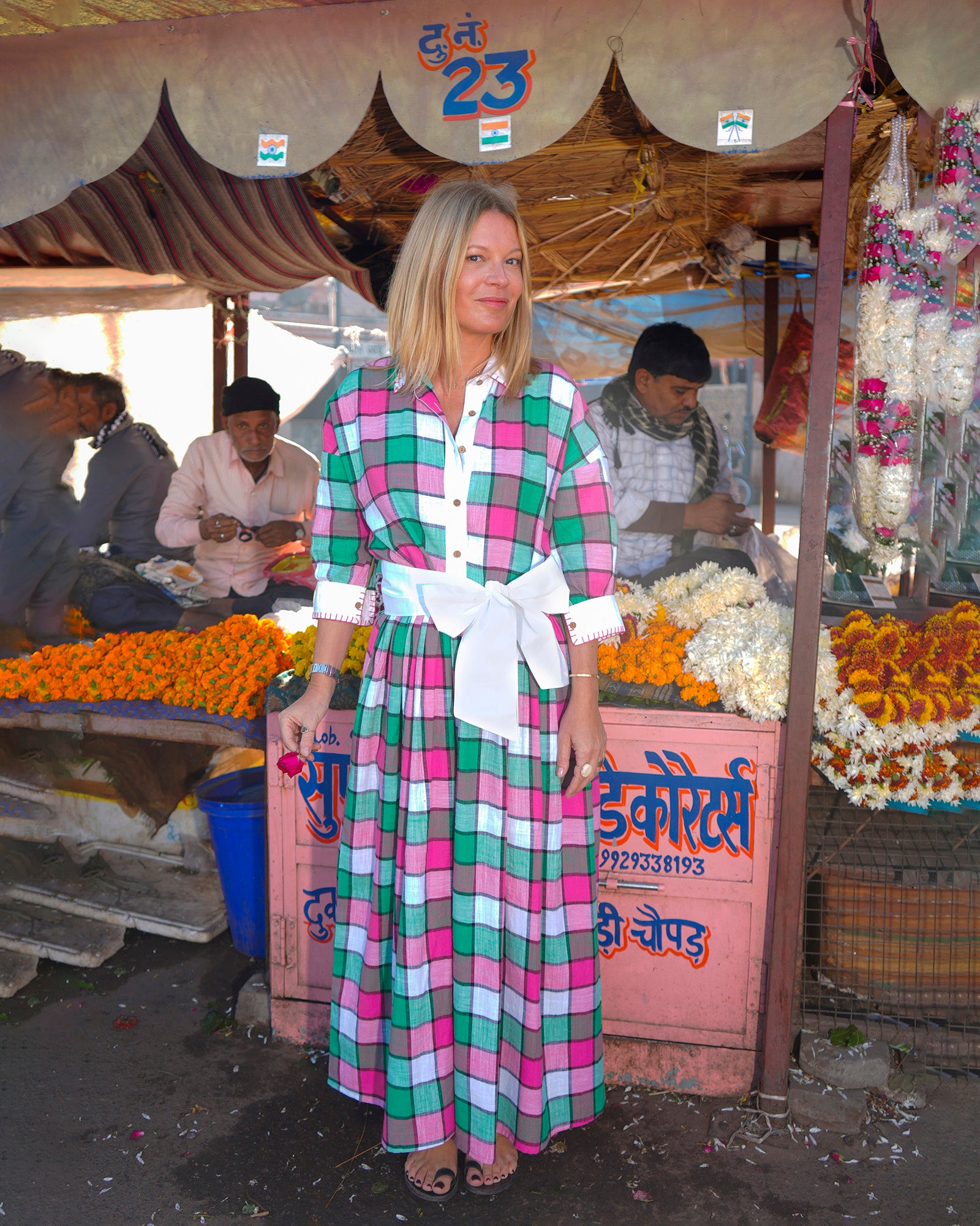 Robe oversize en coton motif a carreaux blanc, rose et vert col chemise brodé à la main à Paris et sa ceinture blanche.