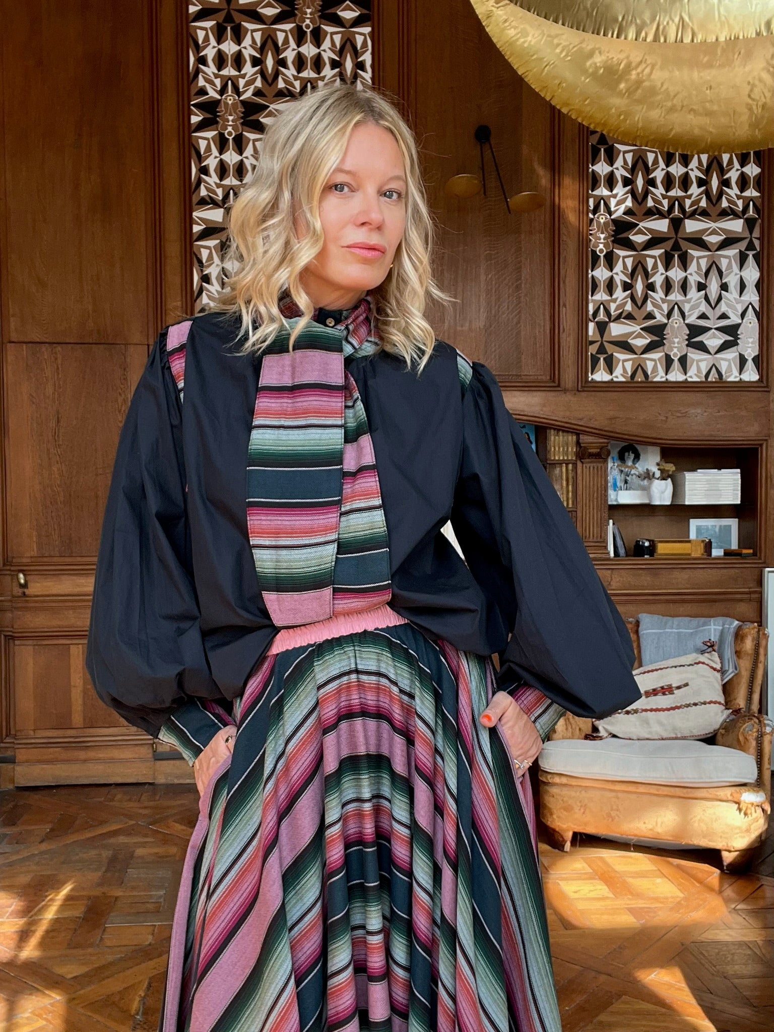 Black linen blouse and cotton Camel tiles, puffy sleeves and removable knot.