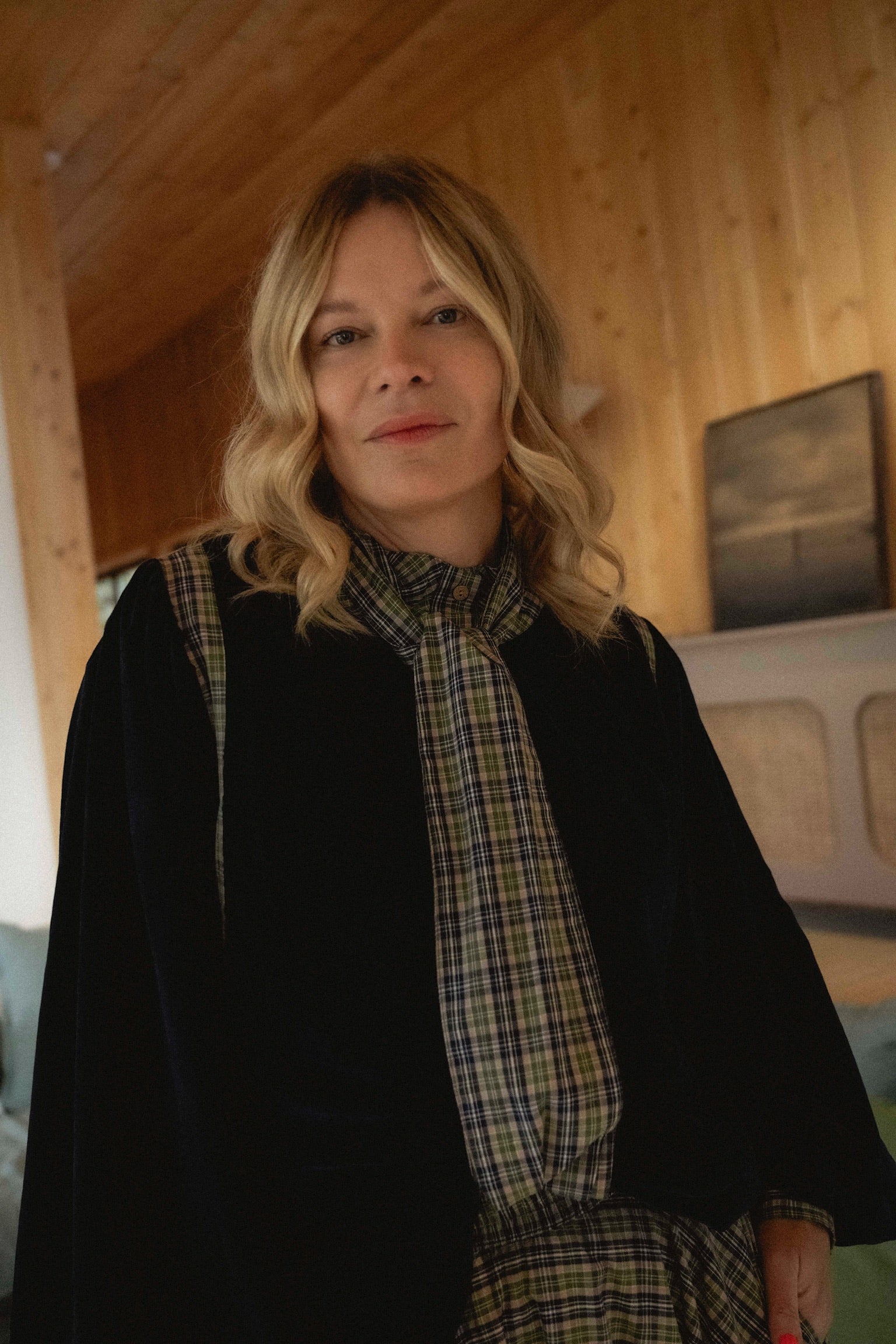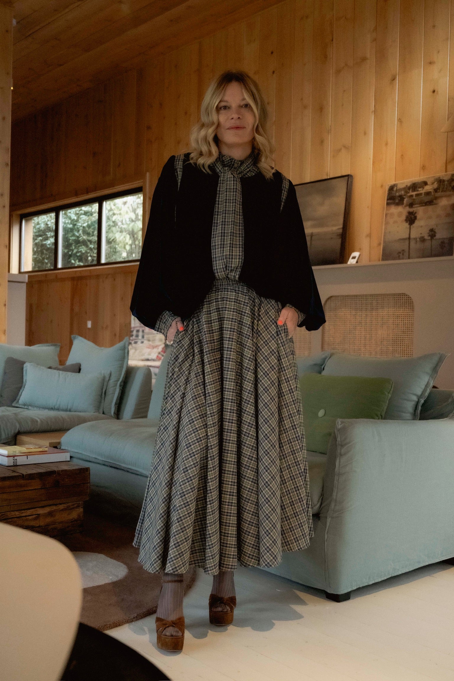 Midnight blue velvet blouse with checkered yoke, puffed sleeves and removable bow.