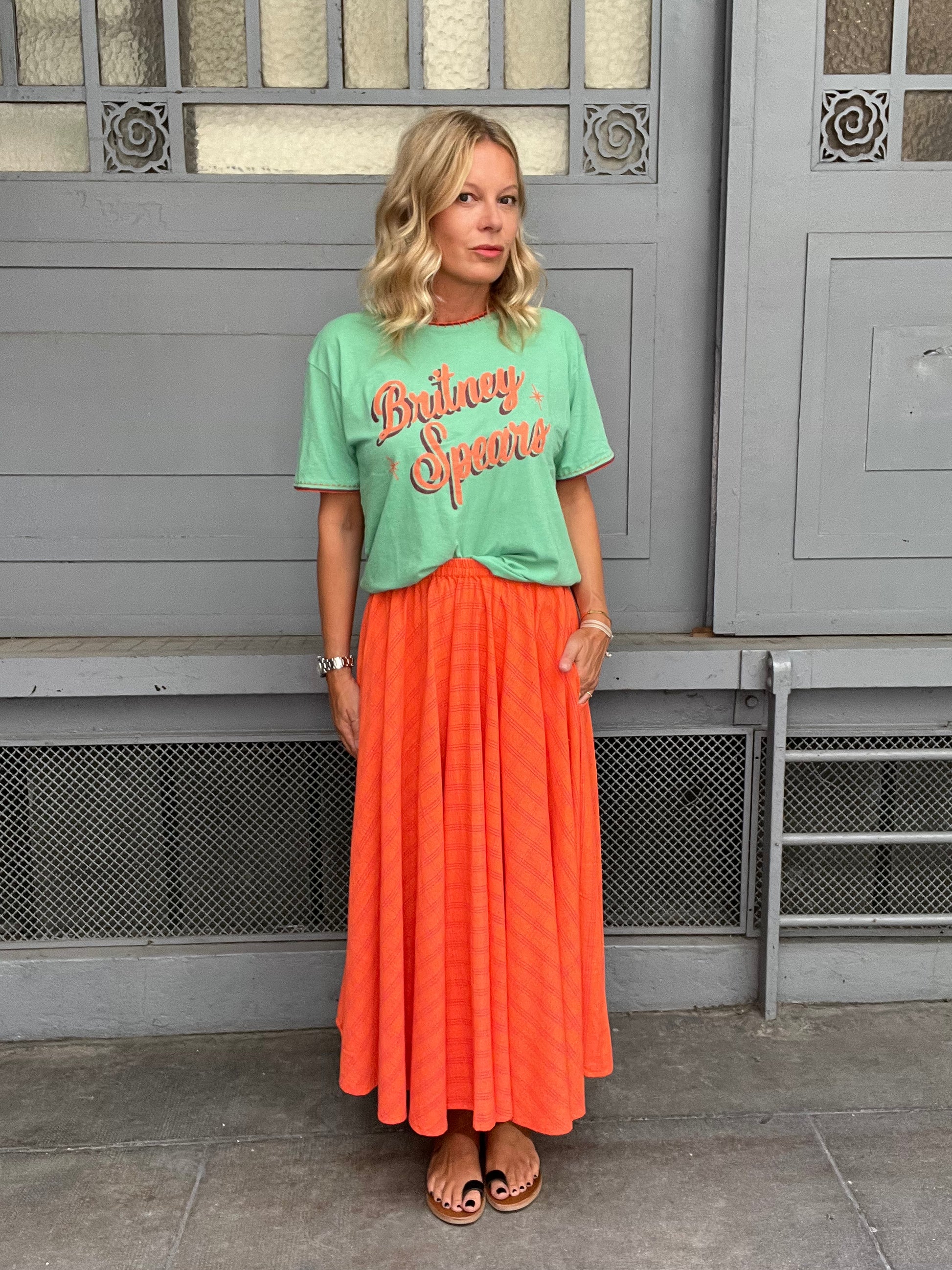 Orange cotton flared skirt with thin stripes, elastic waist.