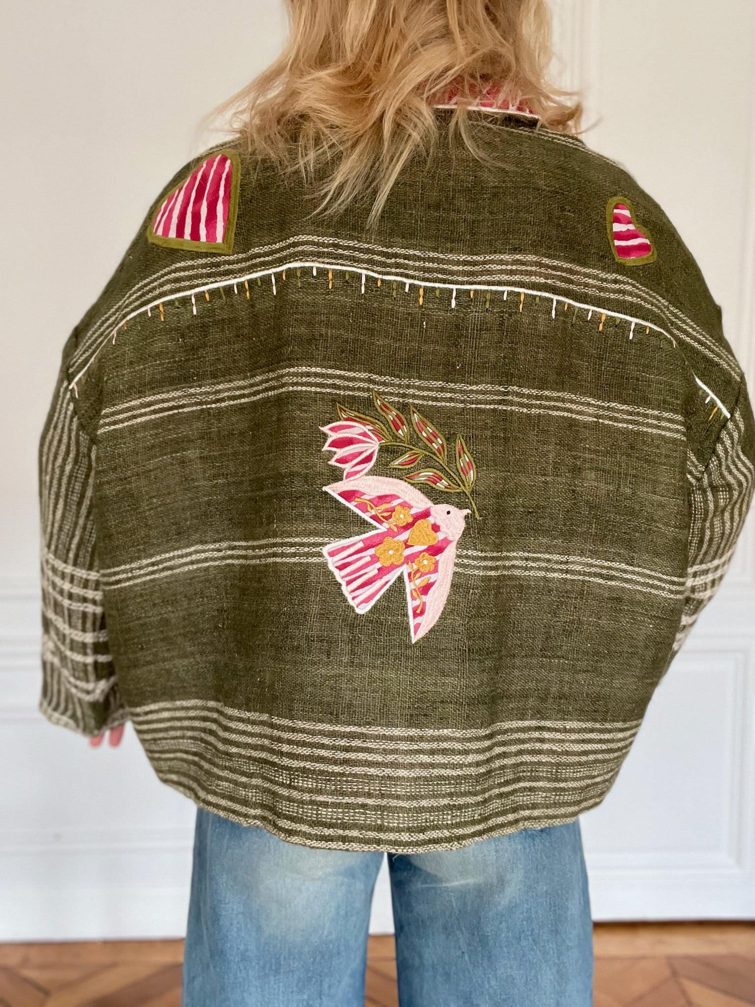 Veste en laine kaki façonnée avec des châles anciens puis brodée.
