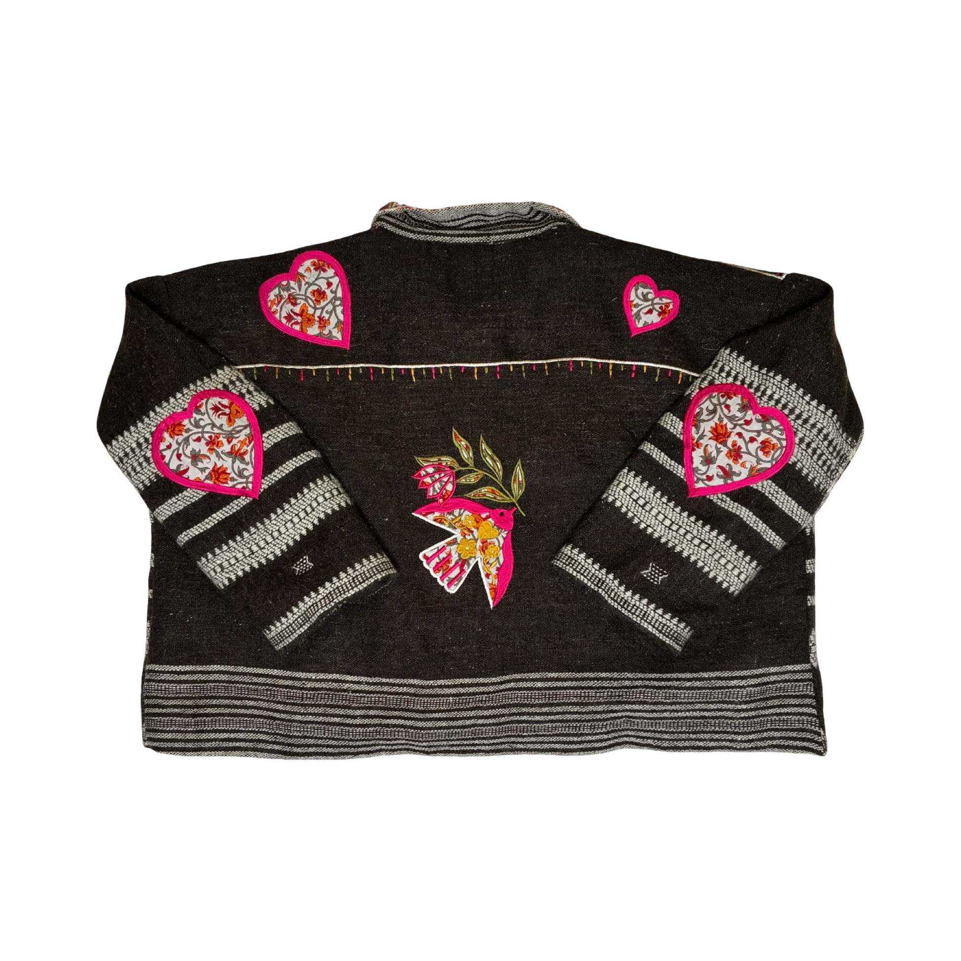 Façonnée à partir de châles anciens en laine, chaque pièce est unique, empreinte des histoires qu’elle porte en elle.