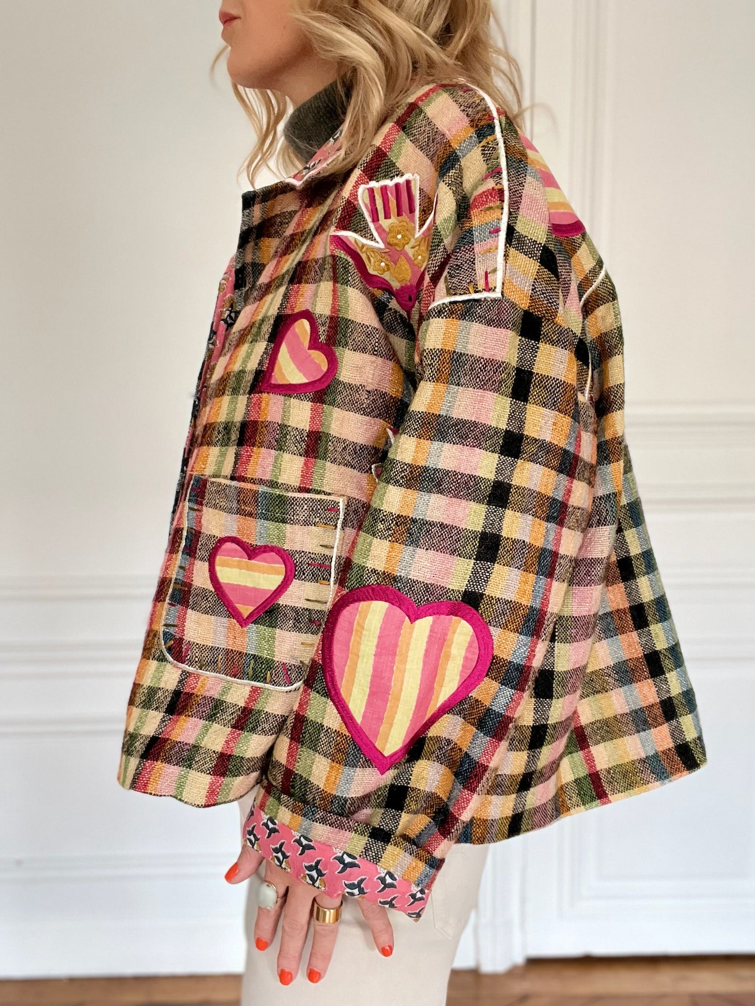 Veste en laine à carreaux façonnée avec des châles anciens puis brodée.