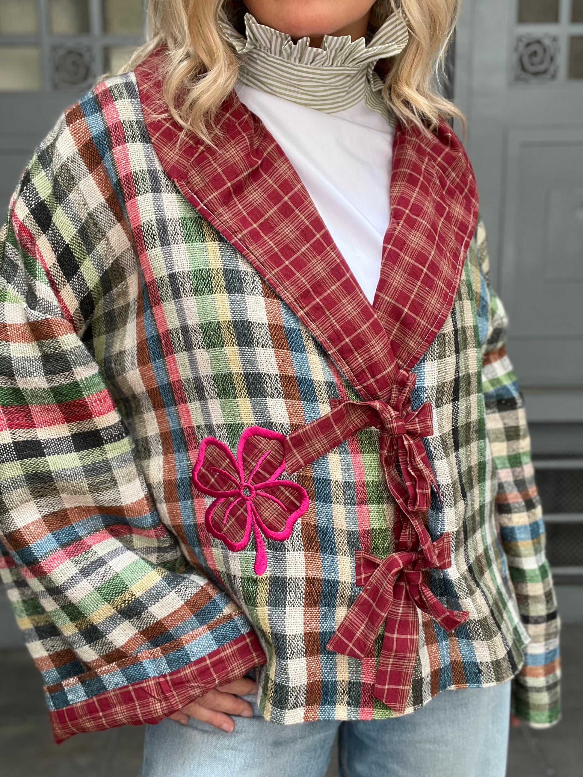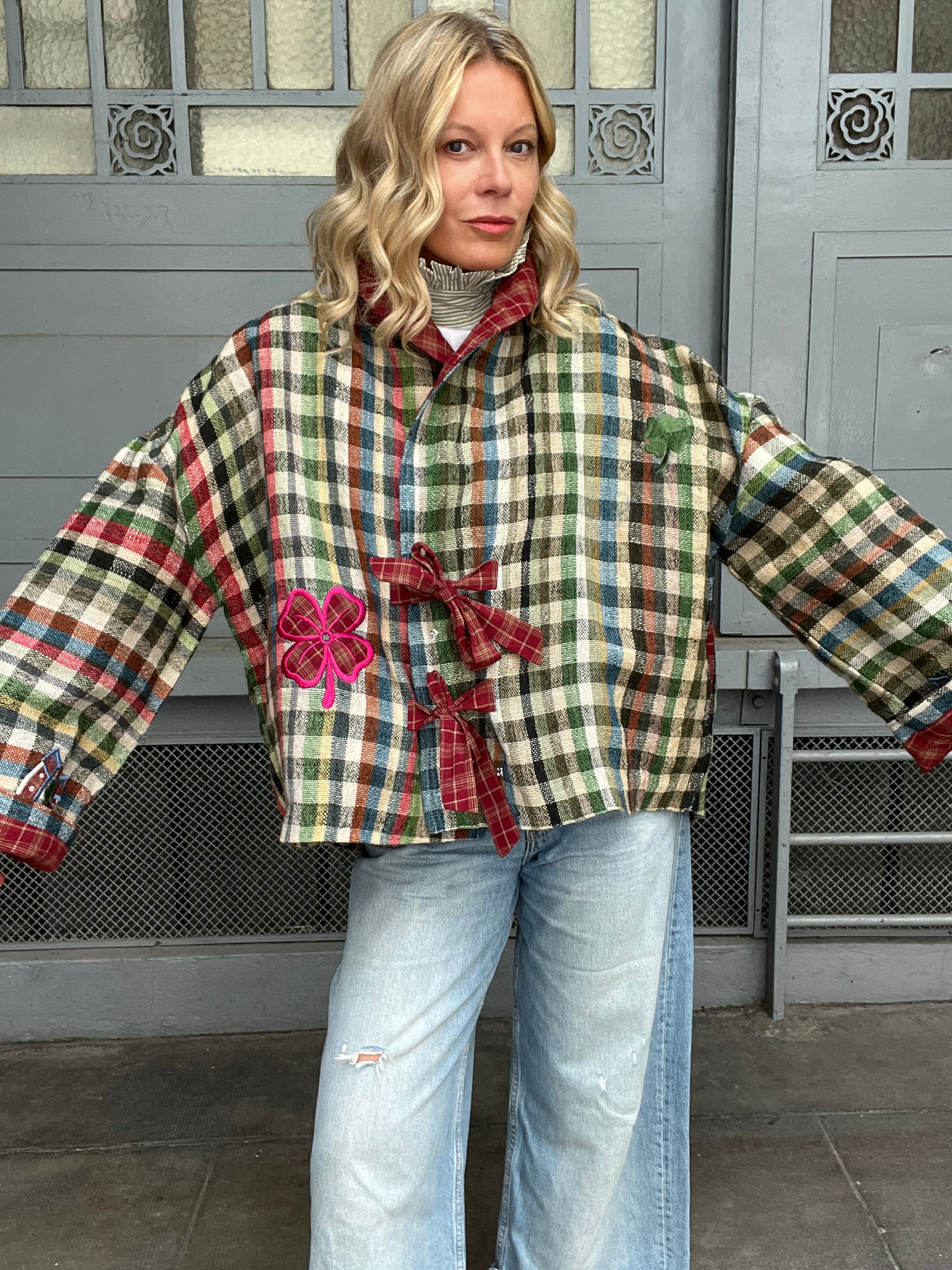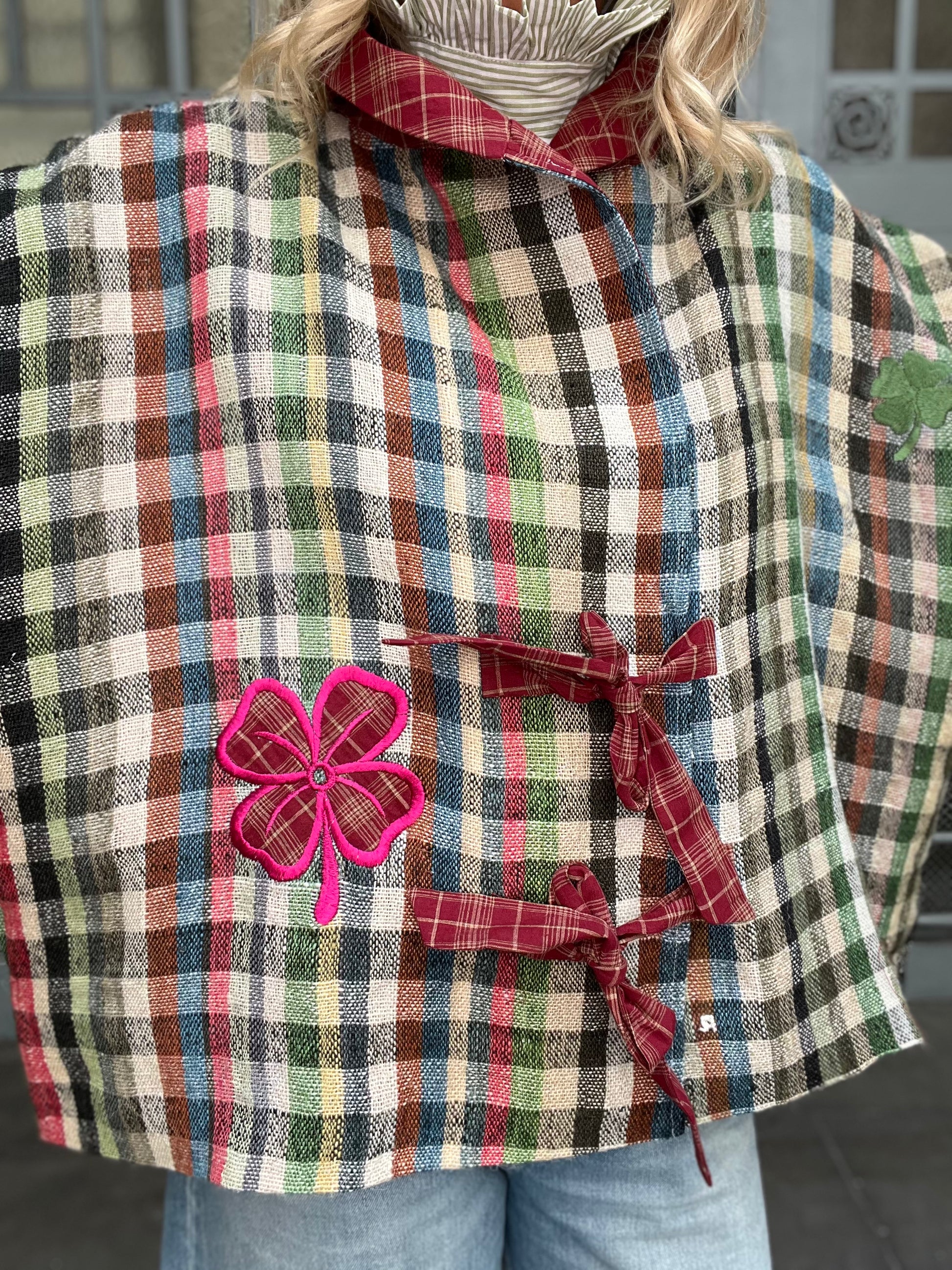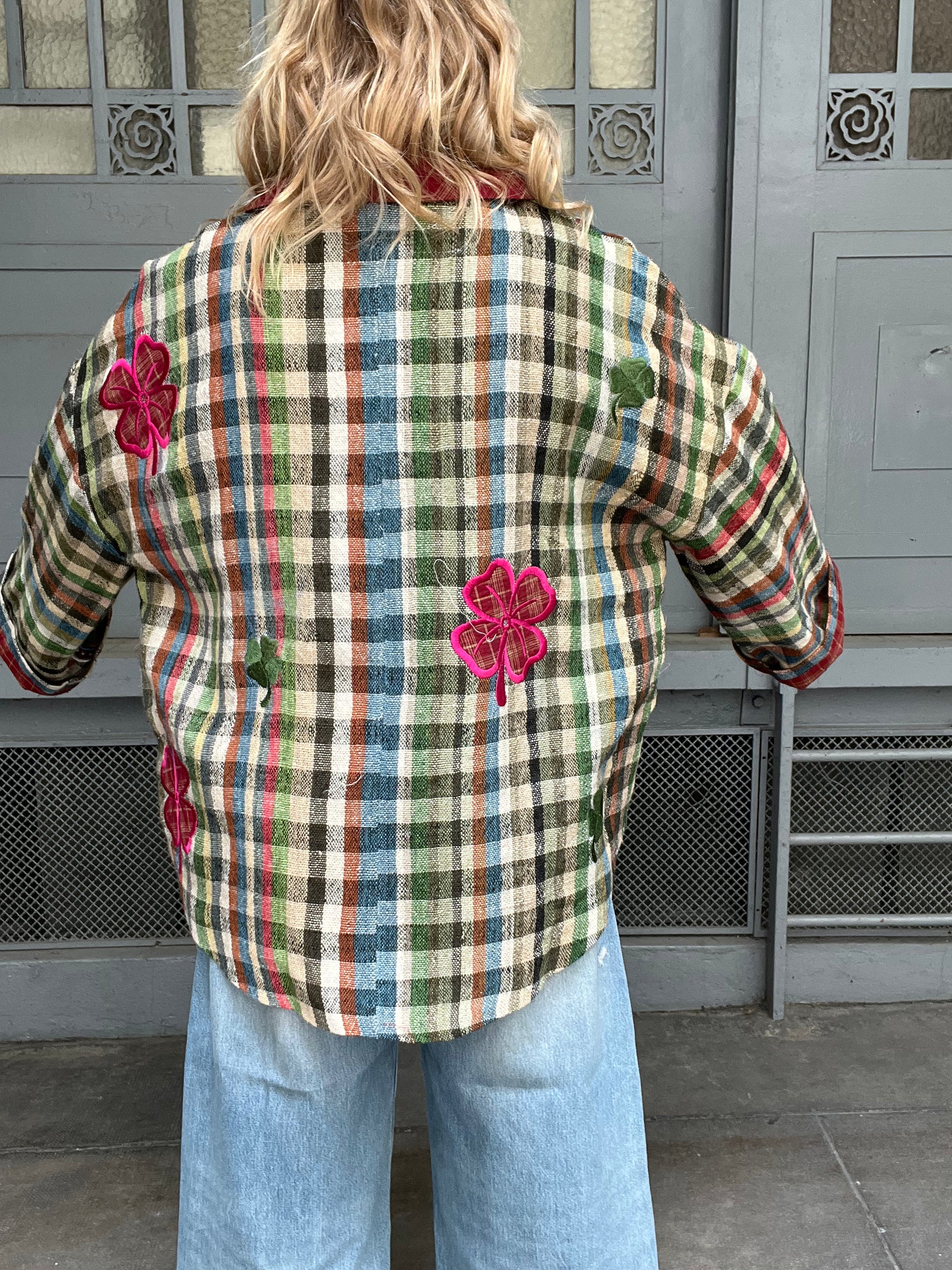 Veste en laine façonnée avec des châles anciens puis brodée de trèfles et de fers à cheval symbolisant la chance.
