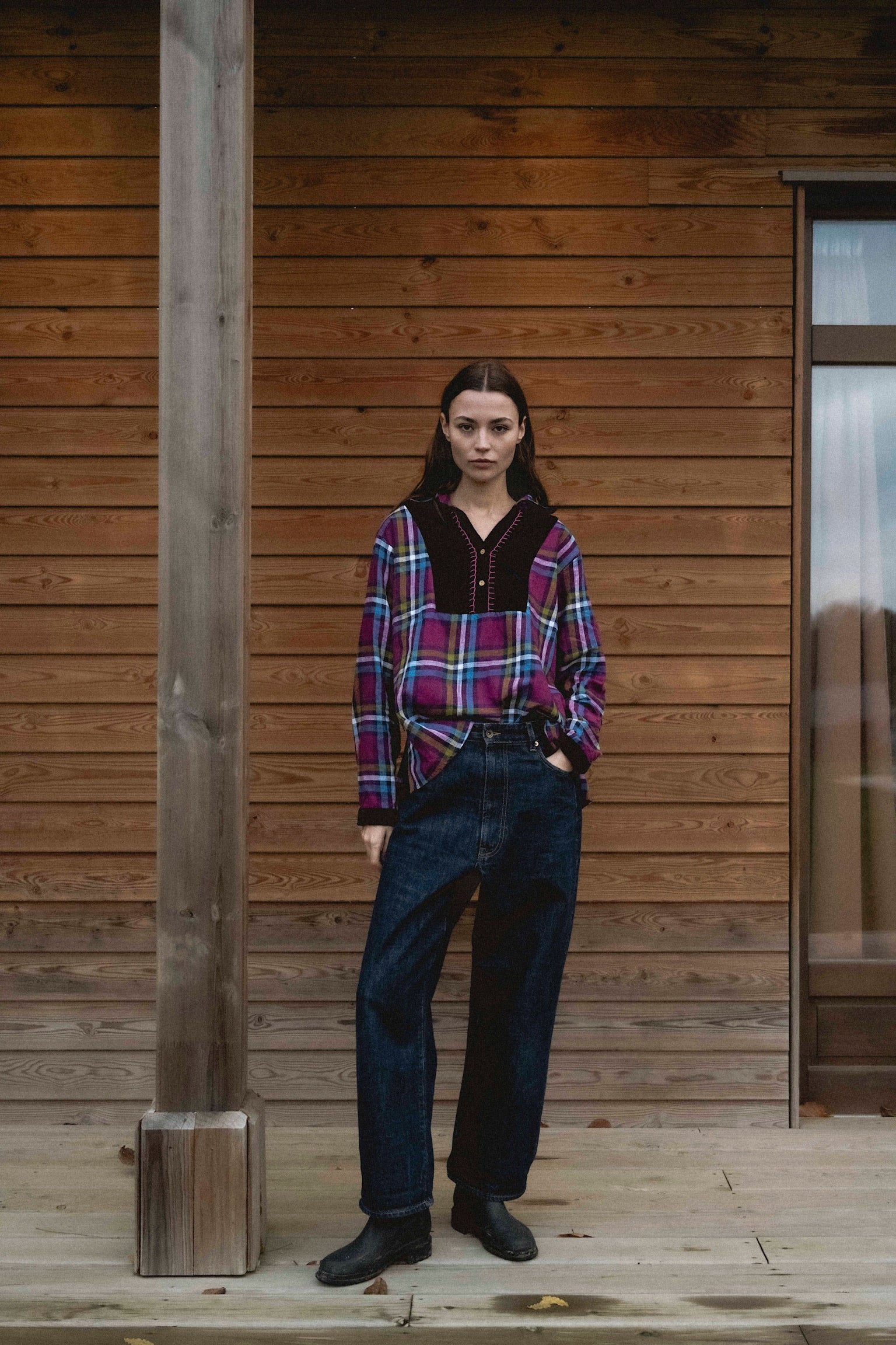 Chemise à carreaux , plastron en velours bleus, brodée et numérotée à la main.