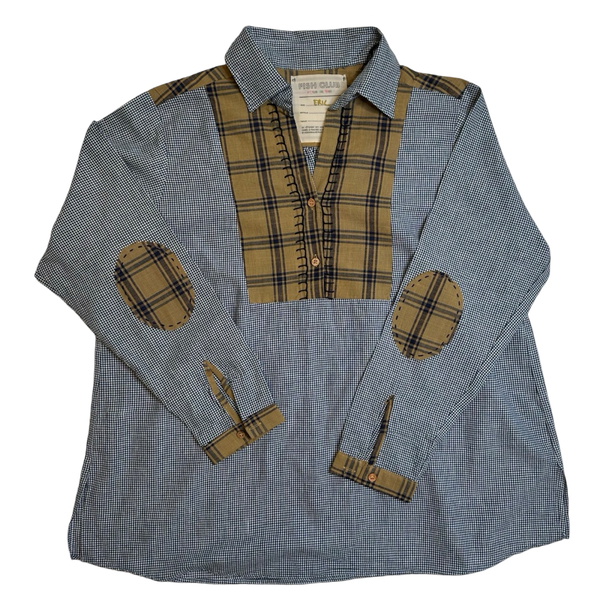 Chemise en coton pied de poule noir et blanc et empiècements à carreaux noir et camel, brodée à la main à Paris.