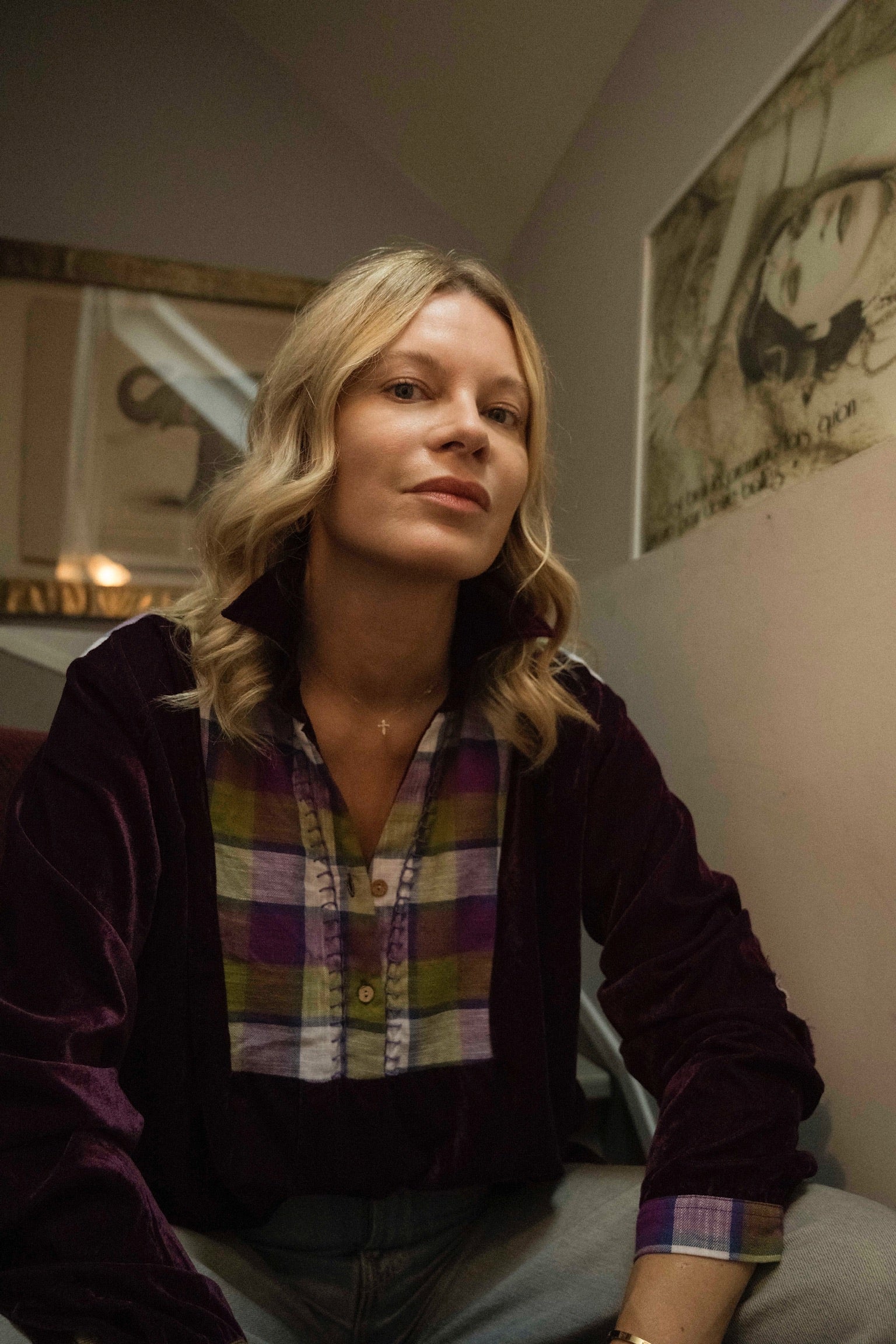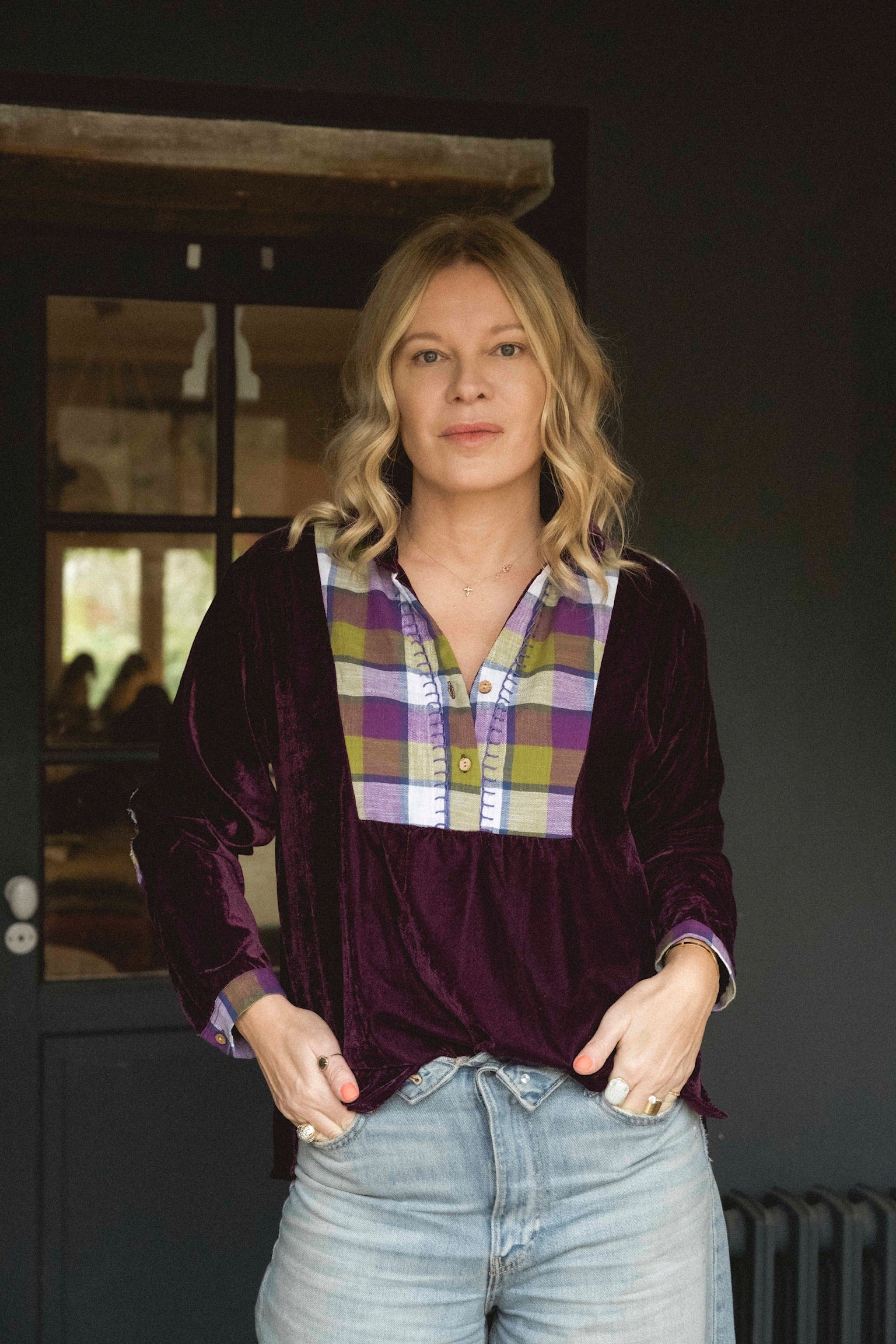 Chemise en velours violet, plastron à carreaux, brodée et numérotée à la main.
