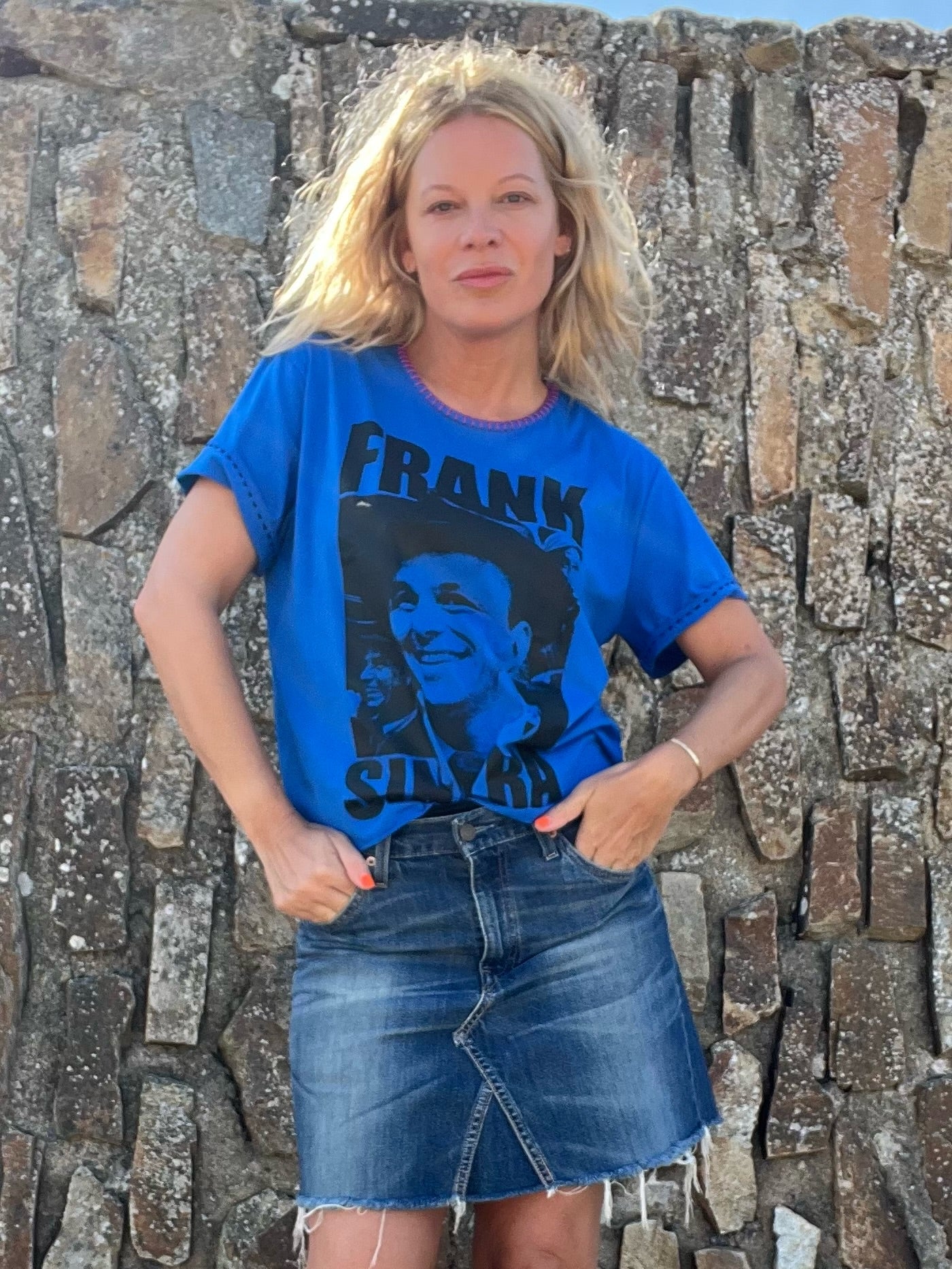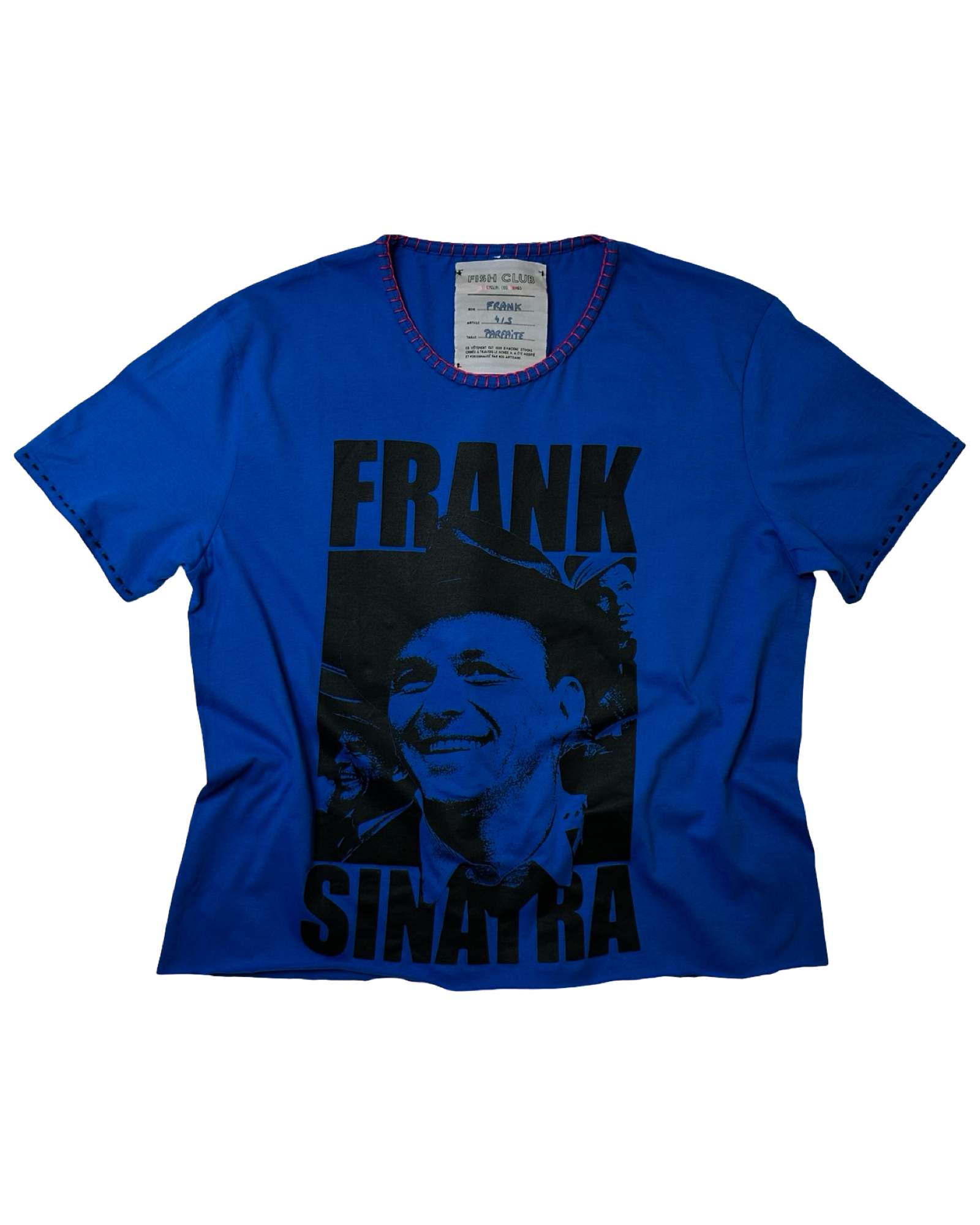 T-shirt en jersey de coton bleu re-travaillé et brodé à la main à Paris.