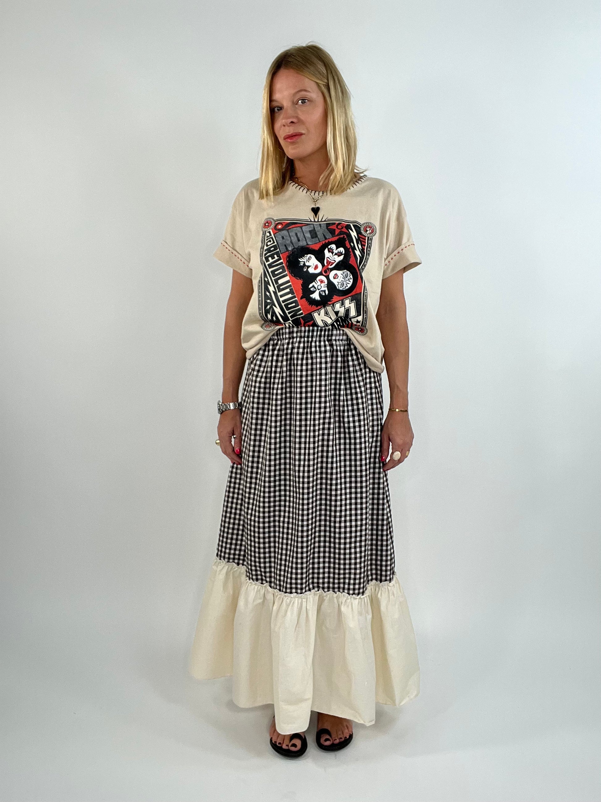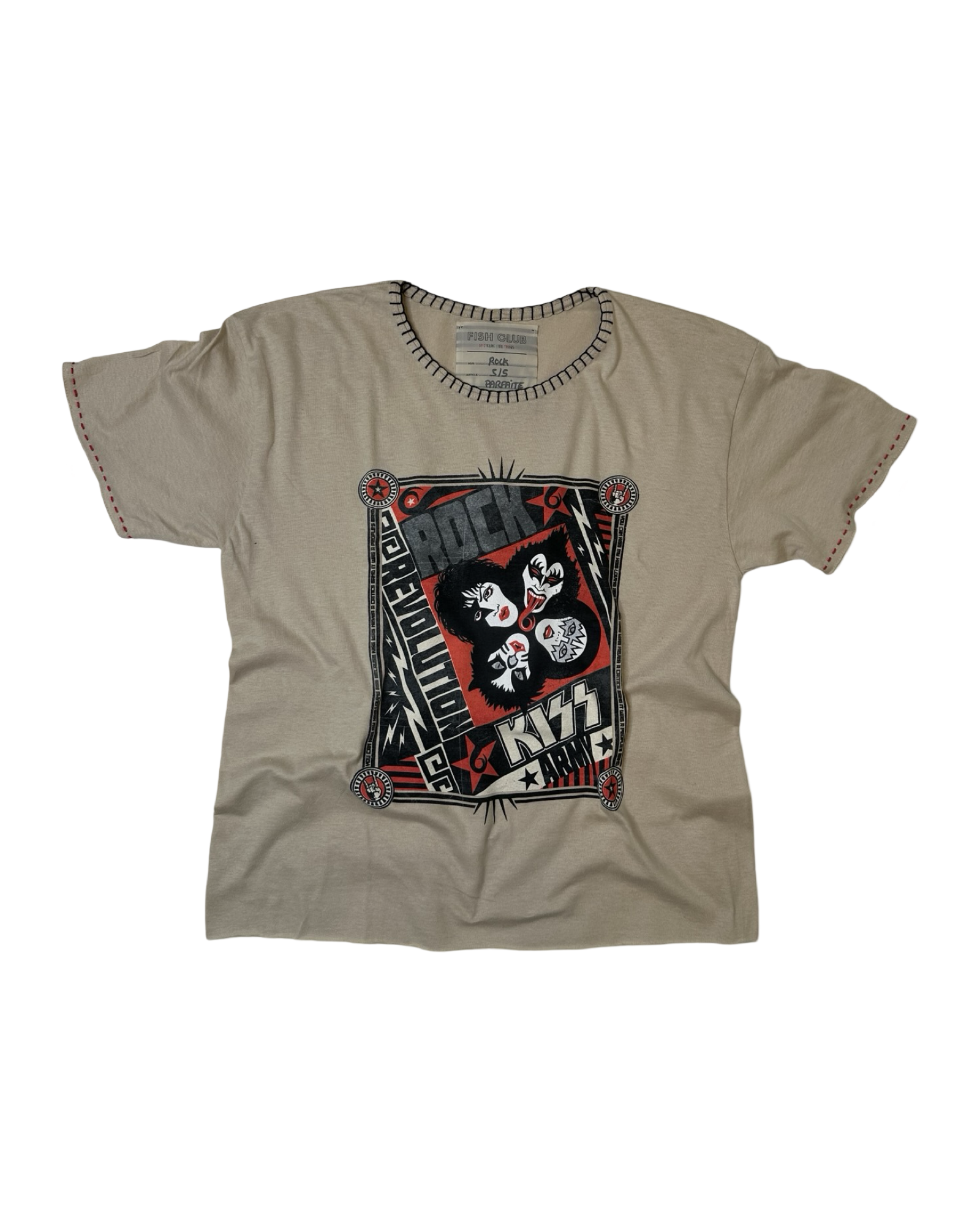 T-shirt en jersey de coton beige re-travaillé et brodé à la main à Paris.