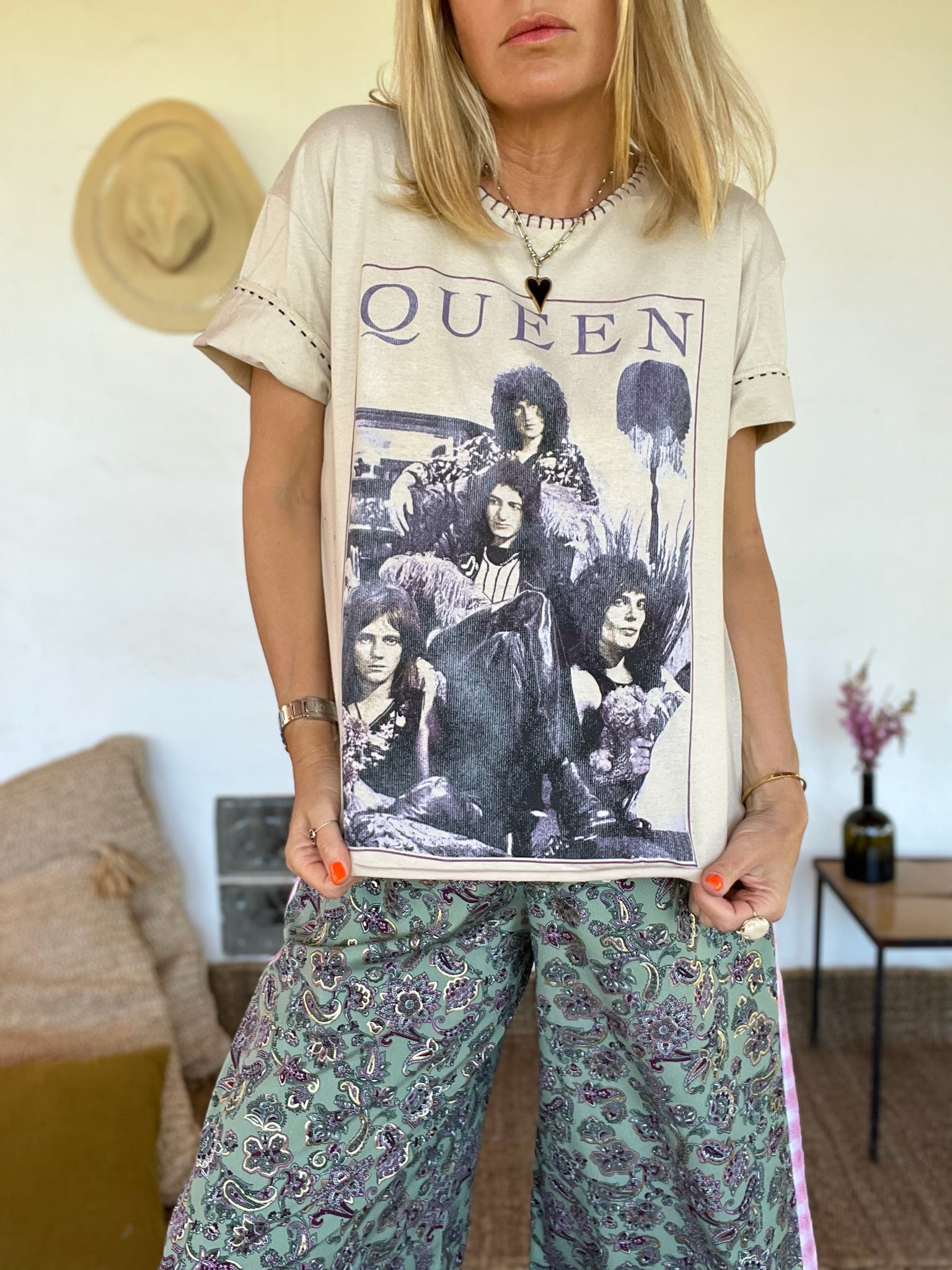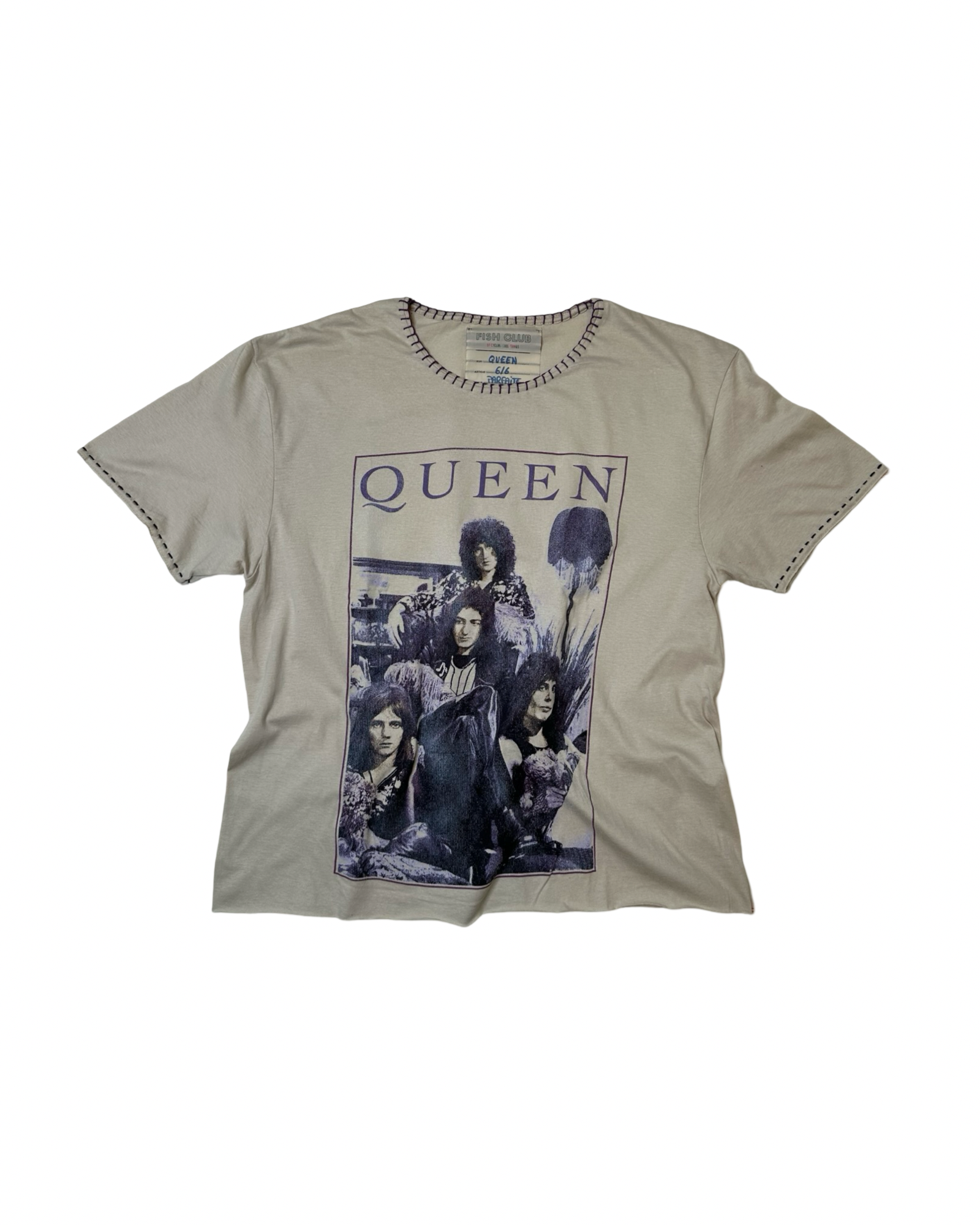 T-shirt en jersey de coton beige re-travaillé et brodé à la main à Paris.