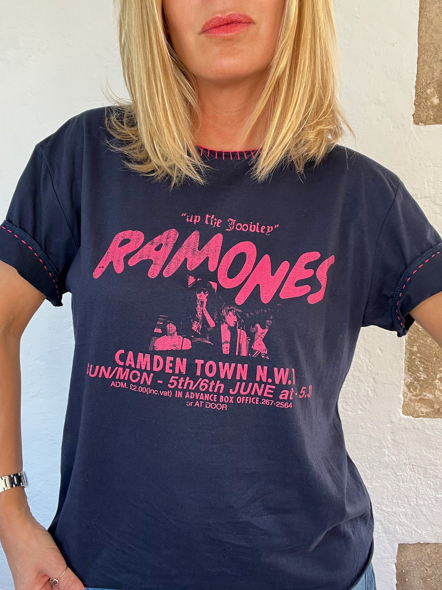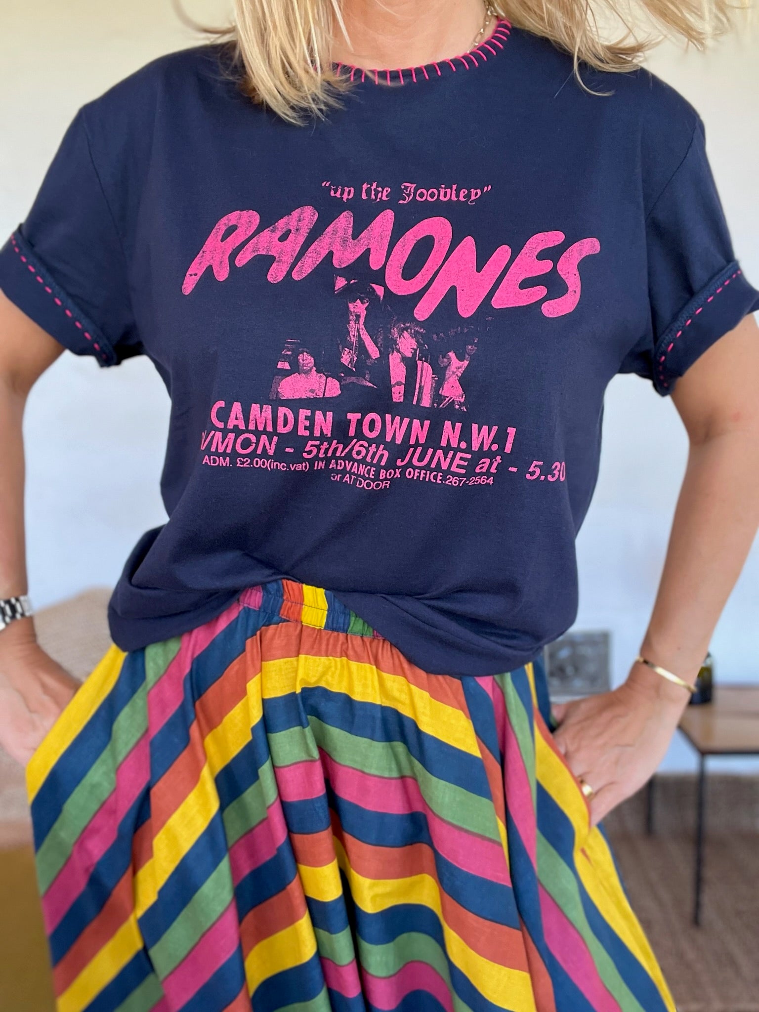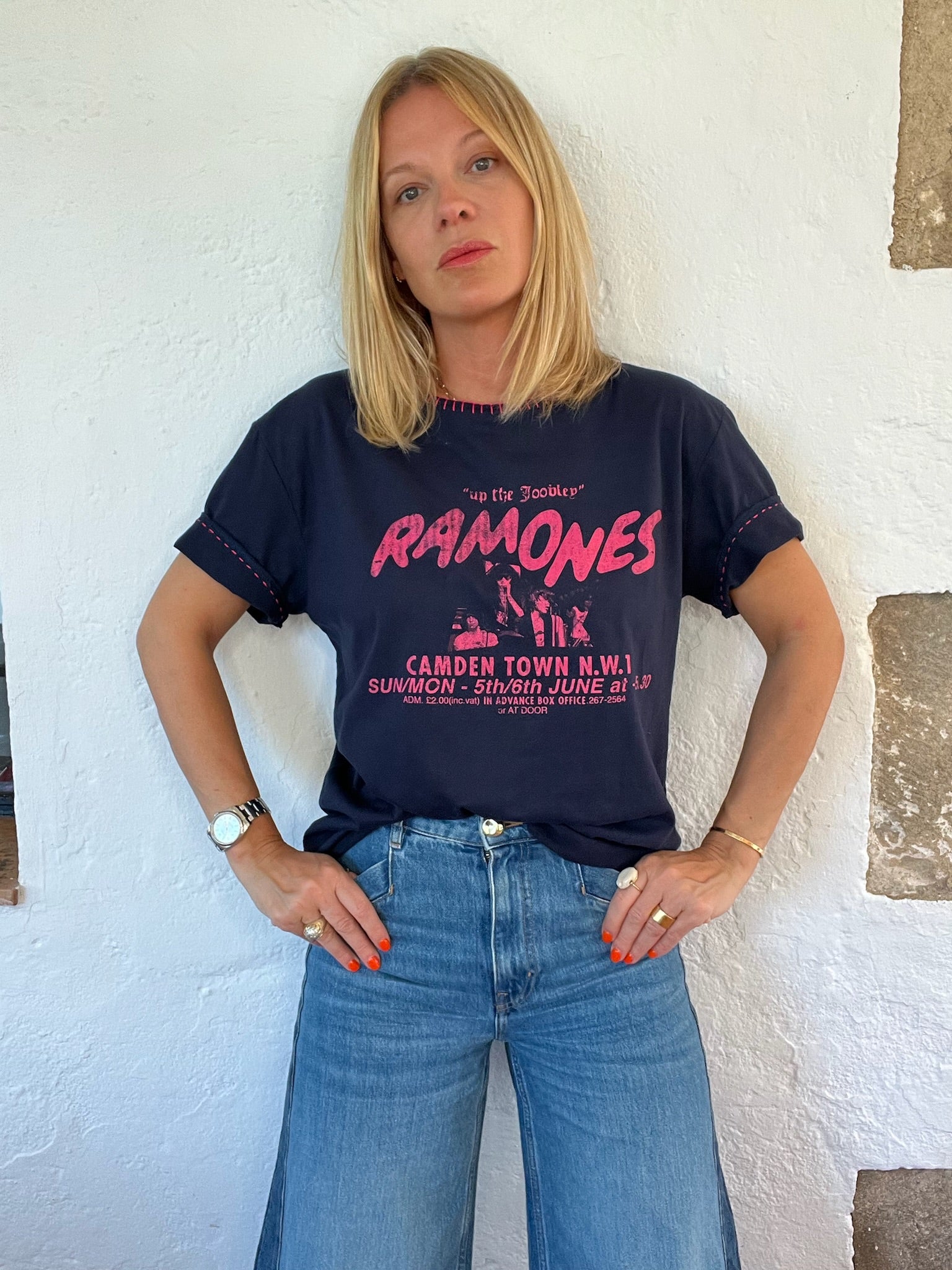 T-shirt en jersey de coton bleu marine re-travaillé et brodé à la main à Paris.