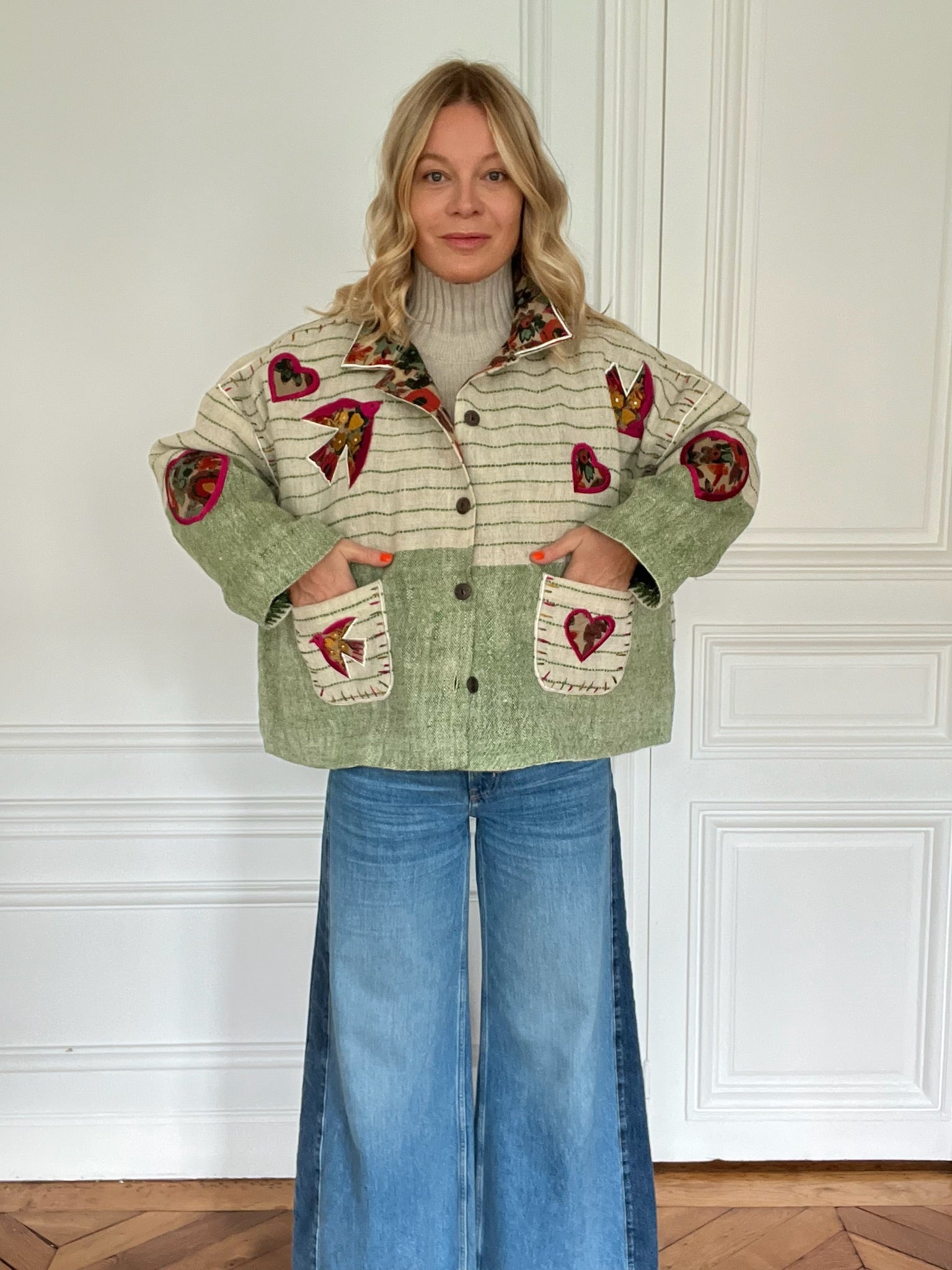 Veste en laine verte façonnée avec des châles anciens puis brodée.